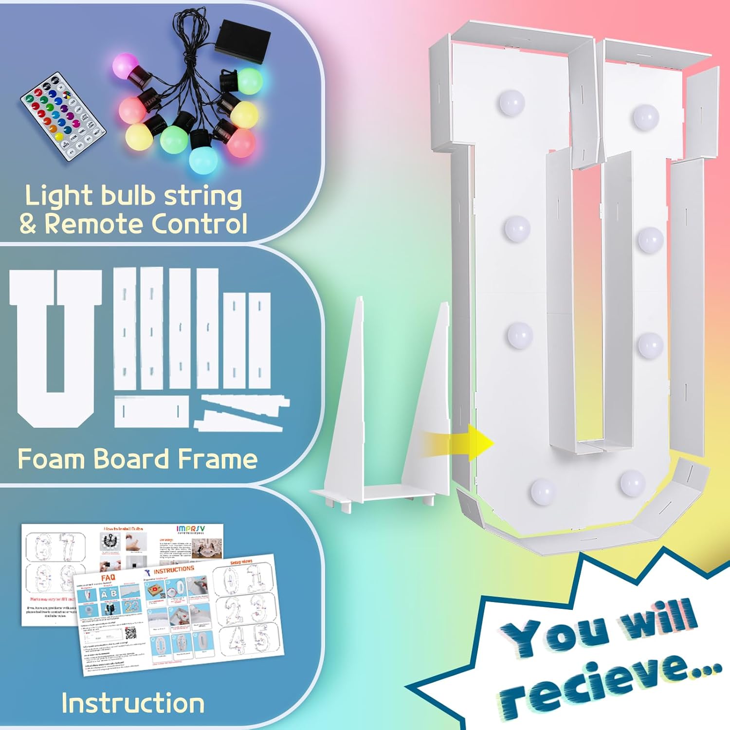 imprsv 3FT Colorful Marquee Light Up Letters U, 18 Colors Light Up Sign Alphabet Sign with Remote, One Letters First Birthday, Large Letters for Birthday Engagement Anniversary Wedding Party Decor