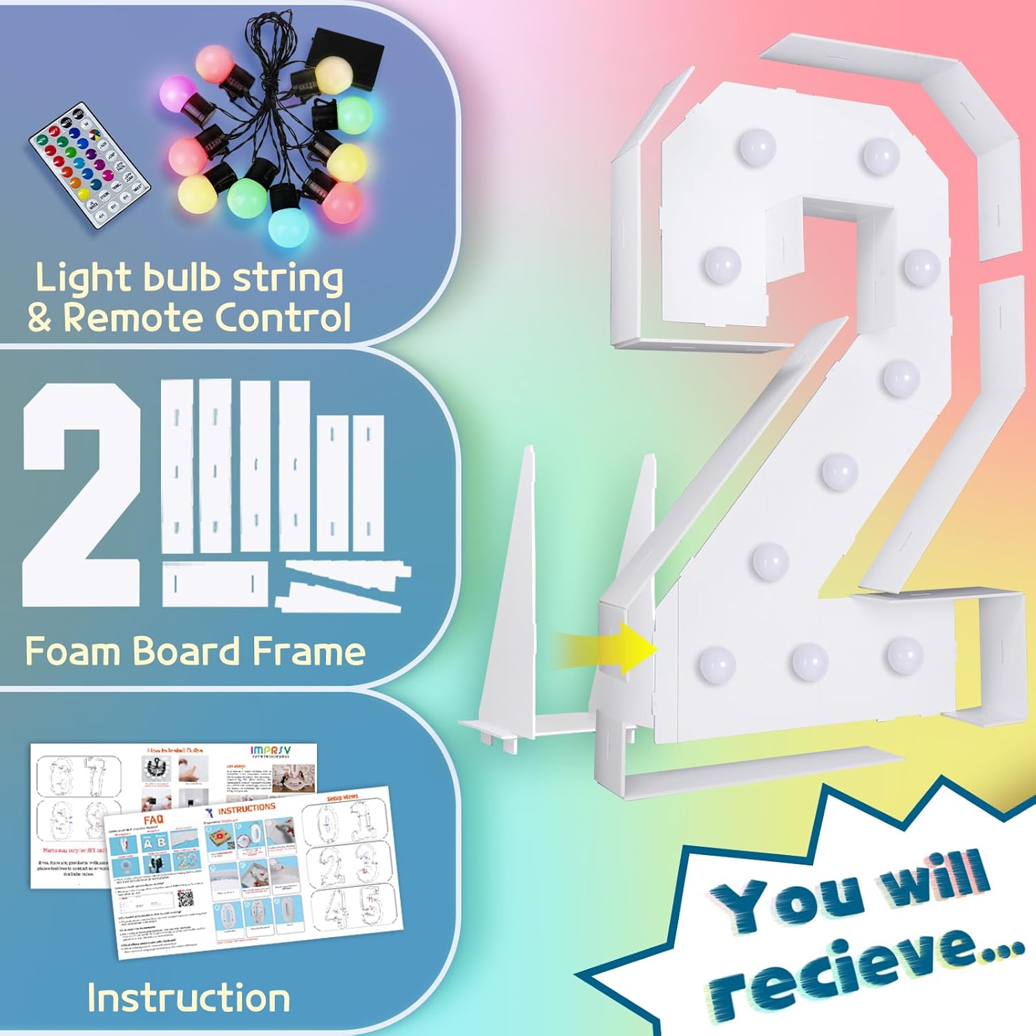 imprsv 4FT Colorful Marquee Numbers,18 Colors Number 2 with Remote, Light Up Numbers Sign for 20th Birthday Decorations Anniversary Party Decor, Pre-Cut Foam Board Kit, Mosaic Sign for Balloon