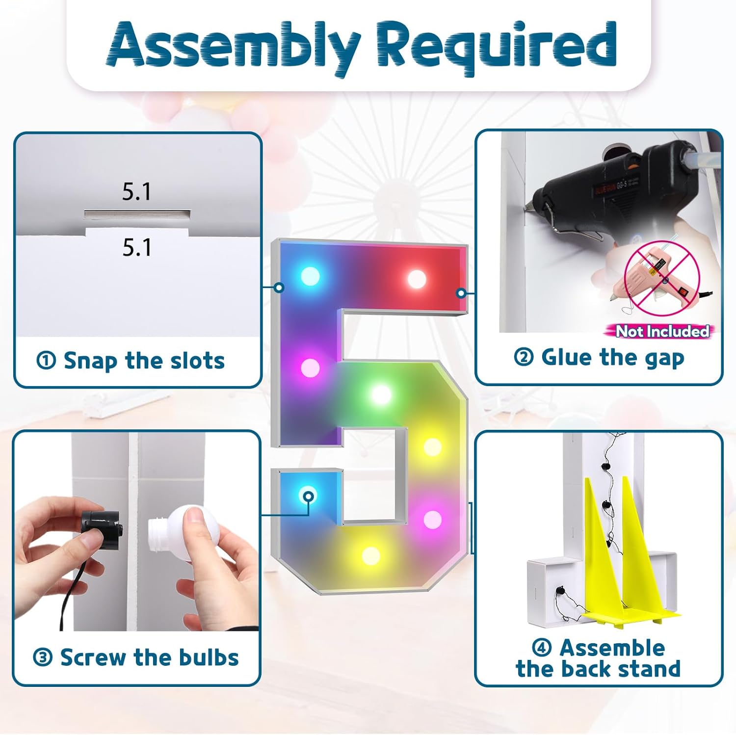 - Assembly Required. To assemble the light up numbers and letters, a hot glue gun is necessary. We have conveniently pre-cut the numbers into several pieces for your convenience. Simply consult the included instruction manual to easily assemble the impressive 4 ft tall and 3ft tall marquee numbers and letters using a hot glue gun.
