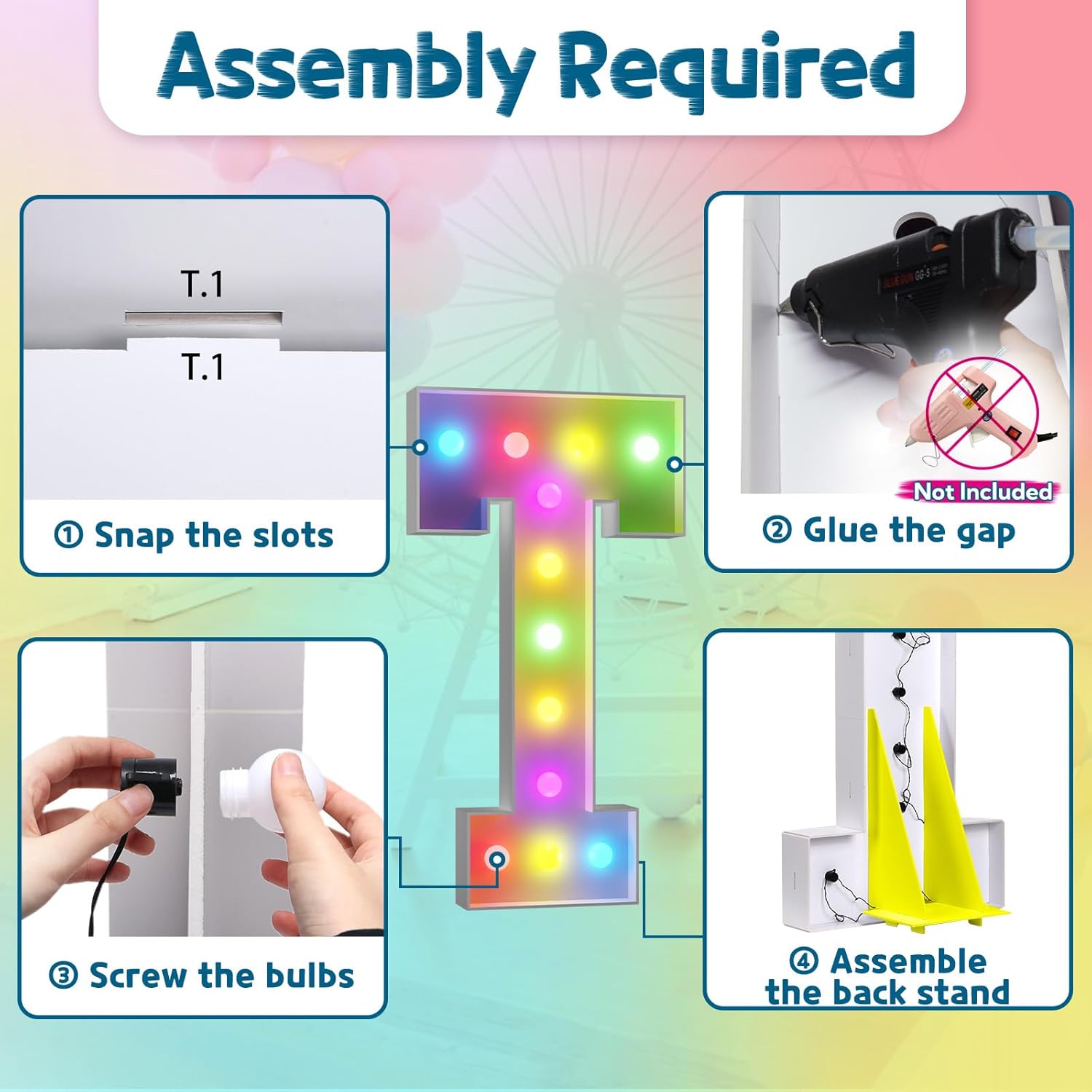 - Assembly Required. To assemble the light up numbers and letters, a hot glue gun is necessary. We have conveniently pre-cut the numbers into several pieces for your convenience. Simply consult the included instruction manual to easily assemble the impressive 4 ft tall and 3ft tall marquee numbers and letters using a hot glue gun.
