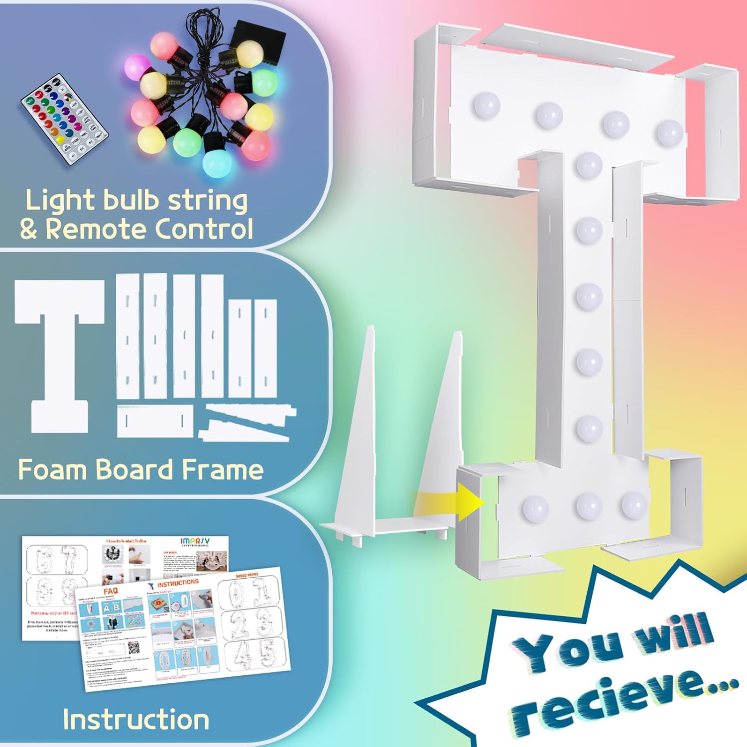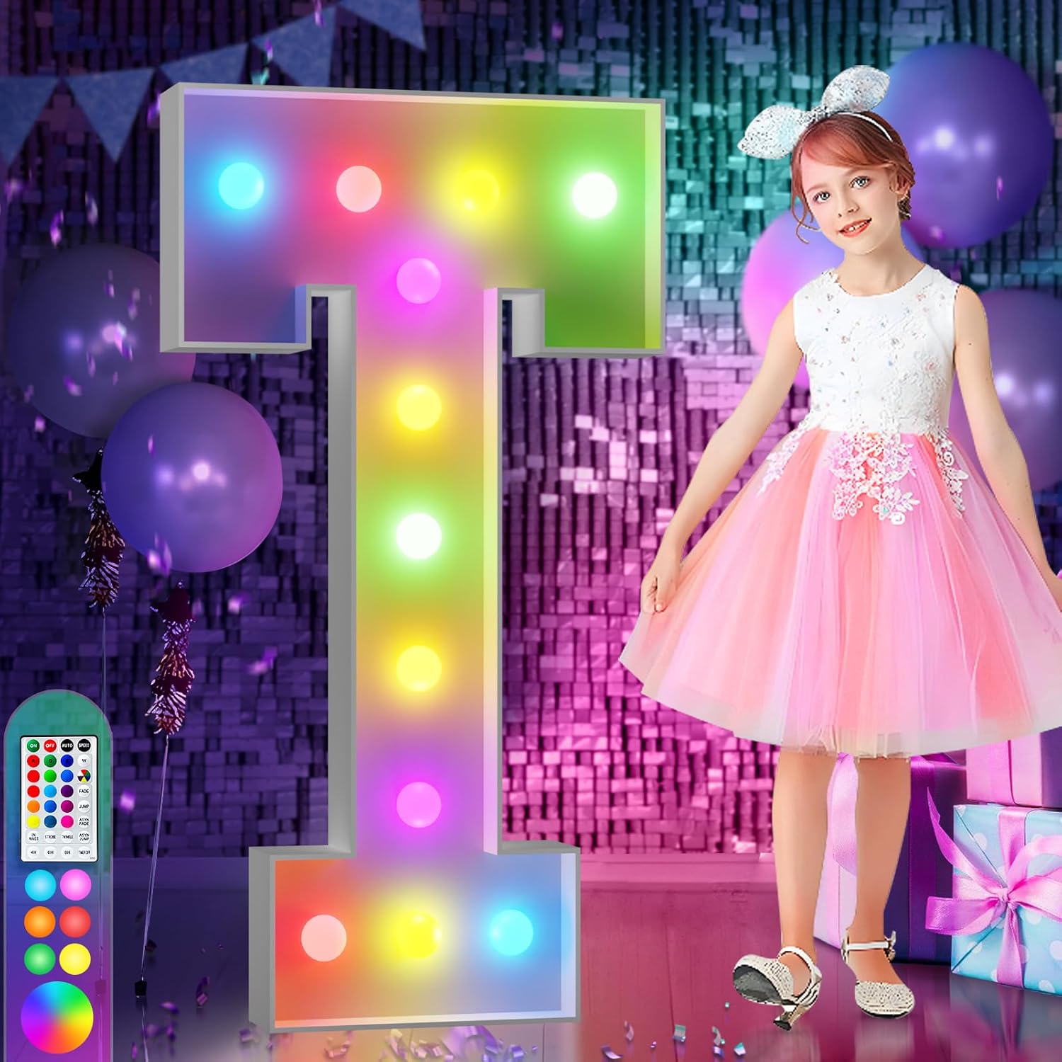 imprsv 4FT Colorful Marquee Light Up Letters T, 18 Colors Large Light up Letters Alphabet Sign with Remote, Large Marry Me Sign, Birthday Party Decorations Baby Shower Anniversary Wedding Decoration