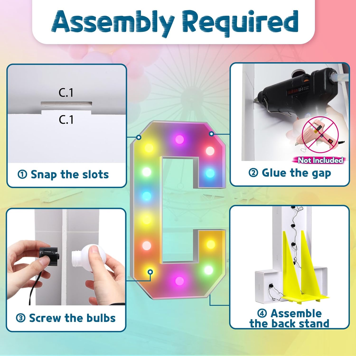 - Assembly Required. To assemble the light up numbers and letters, a hot glue gun is necessary. We have conveniently pre-cut the numbers into several pieces for your convenience. Simply consult the included instruction manual to easily assemble the impressive 4 ft tall and 3ft tall marquee numbers and letters using a hot glue gun.