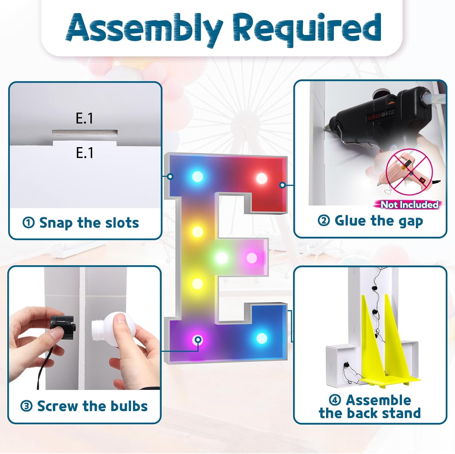 - Assembly Required. To assemble the light up numbers and letters, a hot glue gun is necessary. We have conveniently pre-cut the numbers into several pieces for your convenience. Simply consult the included instruction manual to easily assemble the impressive 4 ft tall and 3ft tall marquee numbers and letters using a hot glue gun.