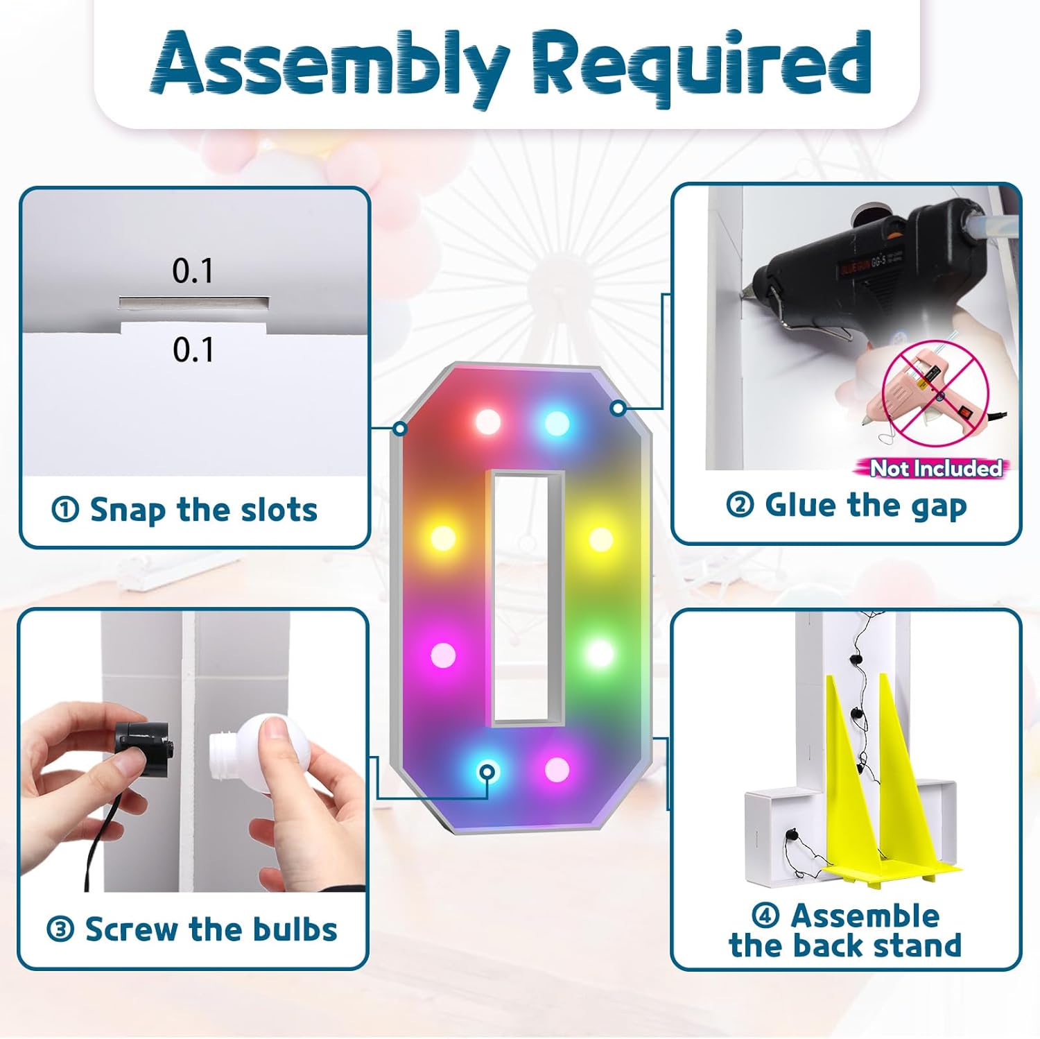 - Assembly Required. To assemble the light up numbers and letters, a hot glue gun is necessary. We have conveniently pre-cut the numbers into several pieces for your convenience. Simply consult the included instruction manual to easily assemble the impressive 4 ft tall and 3ft tall marquee numbers and letters using a hot glue gun.