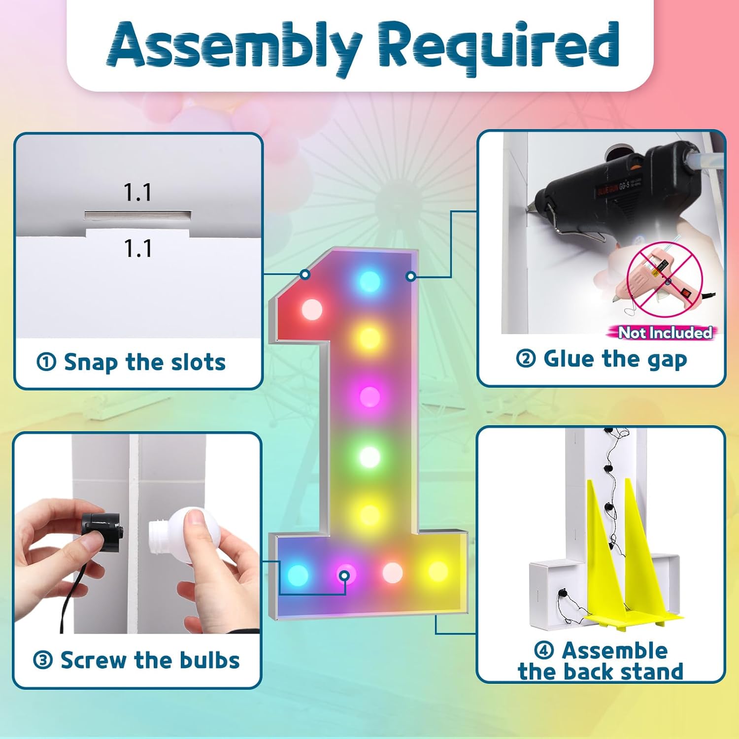 - Assembly Required. To assemble the light up numbers and letters, a hot glue gun is necessary. We have conveniently pre-cut the numbers into several pieces for your convenience. Simply consult the included instruction manual to easily assemble the impressive 4 ft tall and 3ft tall marquee numbers and letters using a hot glue gun.