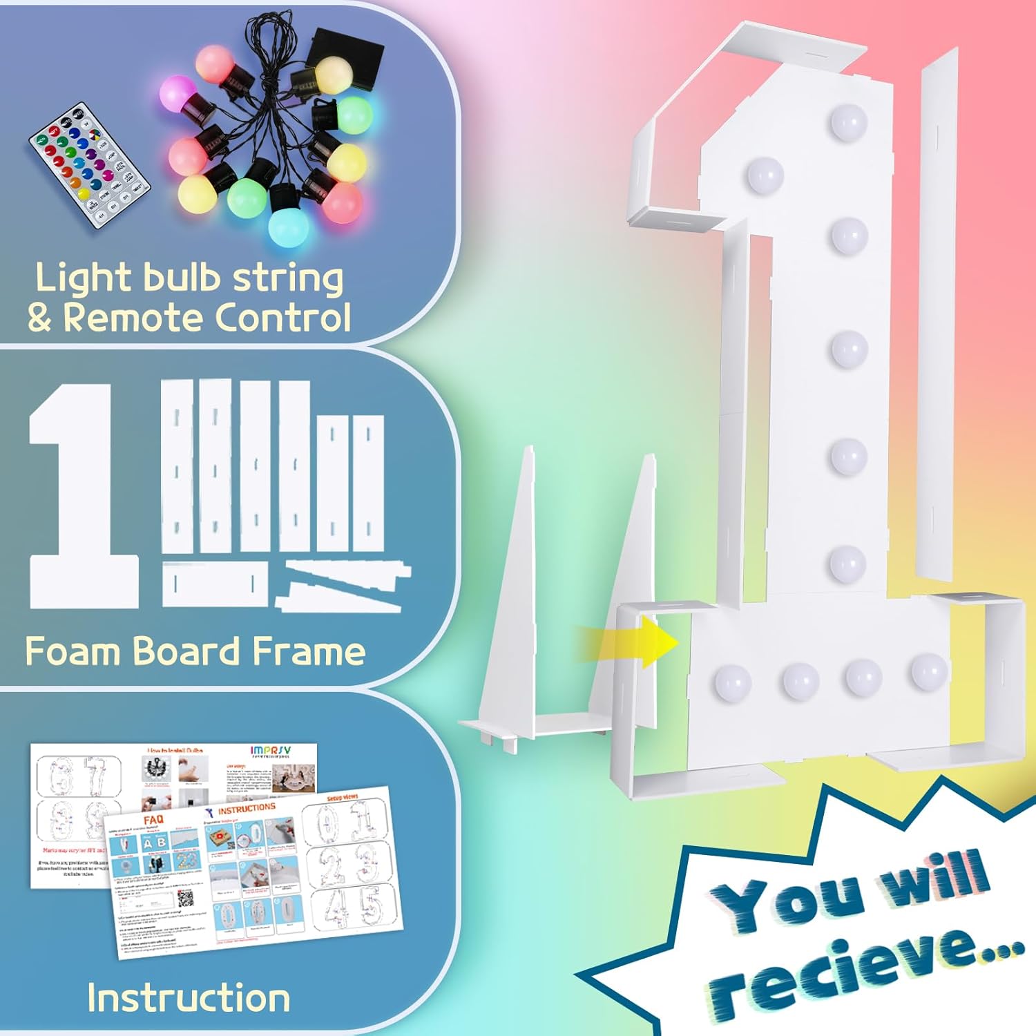 imprsv 4FT Colorful Marquee Numbers,18 Colors Number 1 with Remote, Light Up Numbers Sign for 1st Birthday Decorations Anniversary Party Decor, Pre-Cut Foam Board Kit, Mosaic Sign for Balloon
