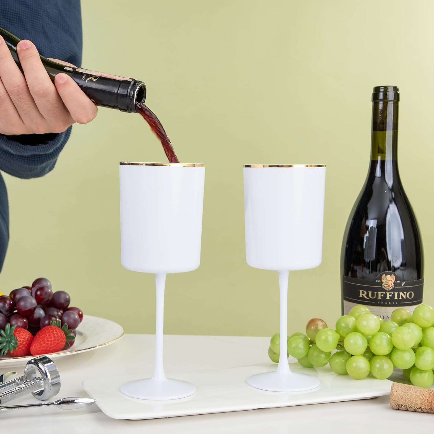 Ciaell 12 Pack White Plastic Wine Glasses with Stem - 10 Oz White and Gold Disposable Wine Glasses for Parties & Weddings & Poolside & Toasting & Outdoors & Graduation