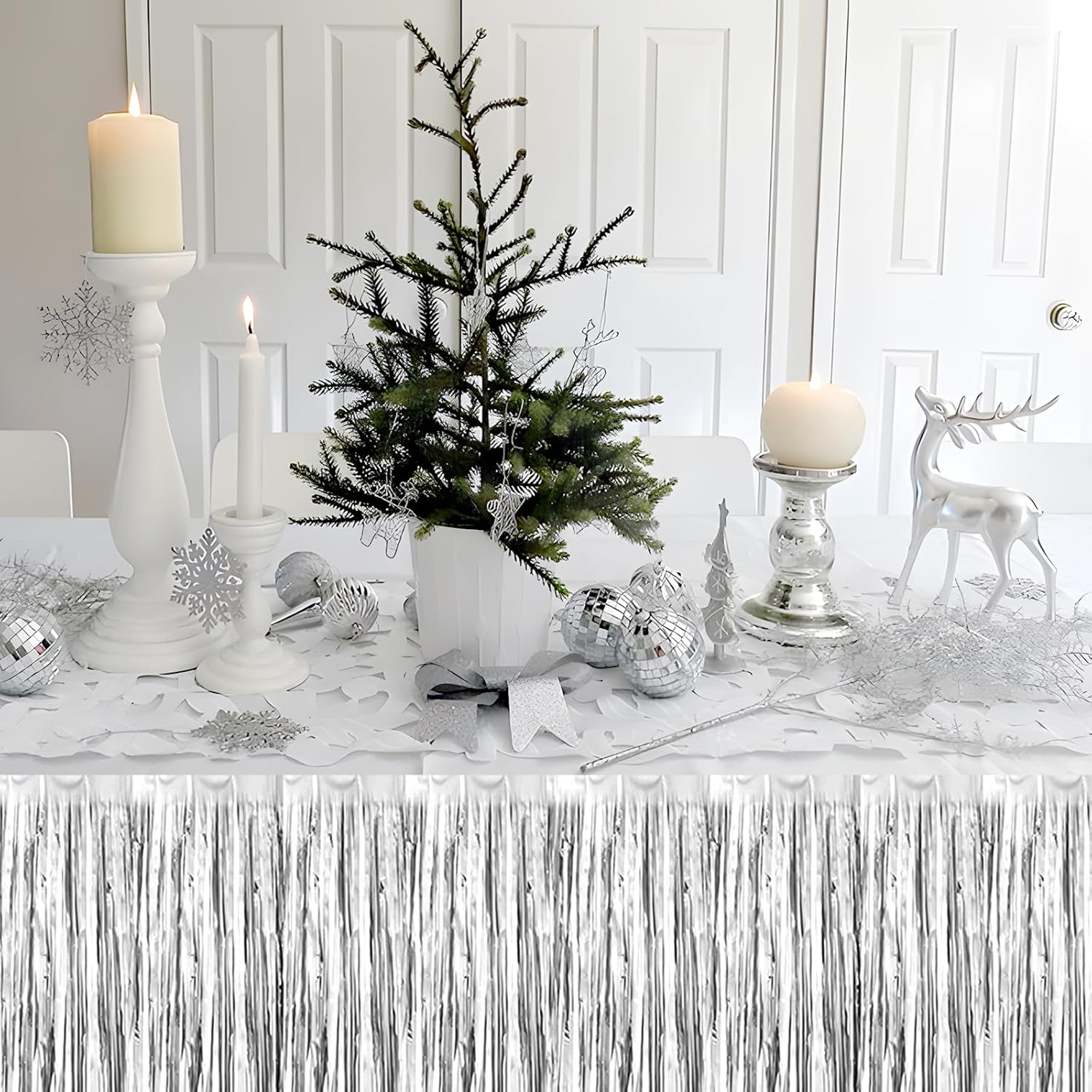 3 Pack 29x108 Inch Silver Foil Fringe Table Skirts Metallic Banner for Tinsel Streamer Garland Backdrop for Parade Floats Wedding Thanksgiving Birthday Christmas Halloween Party Decoration