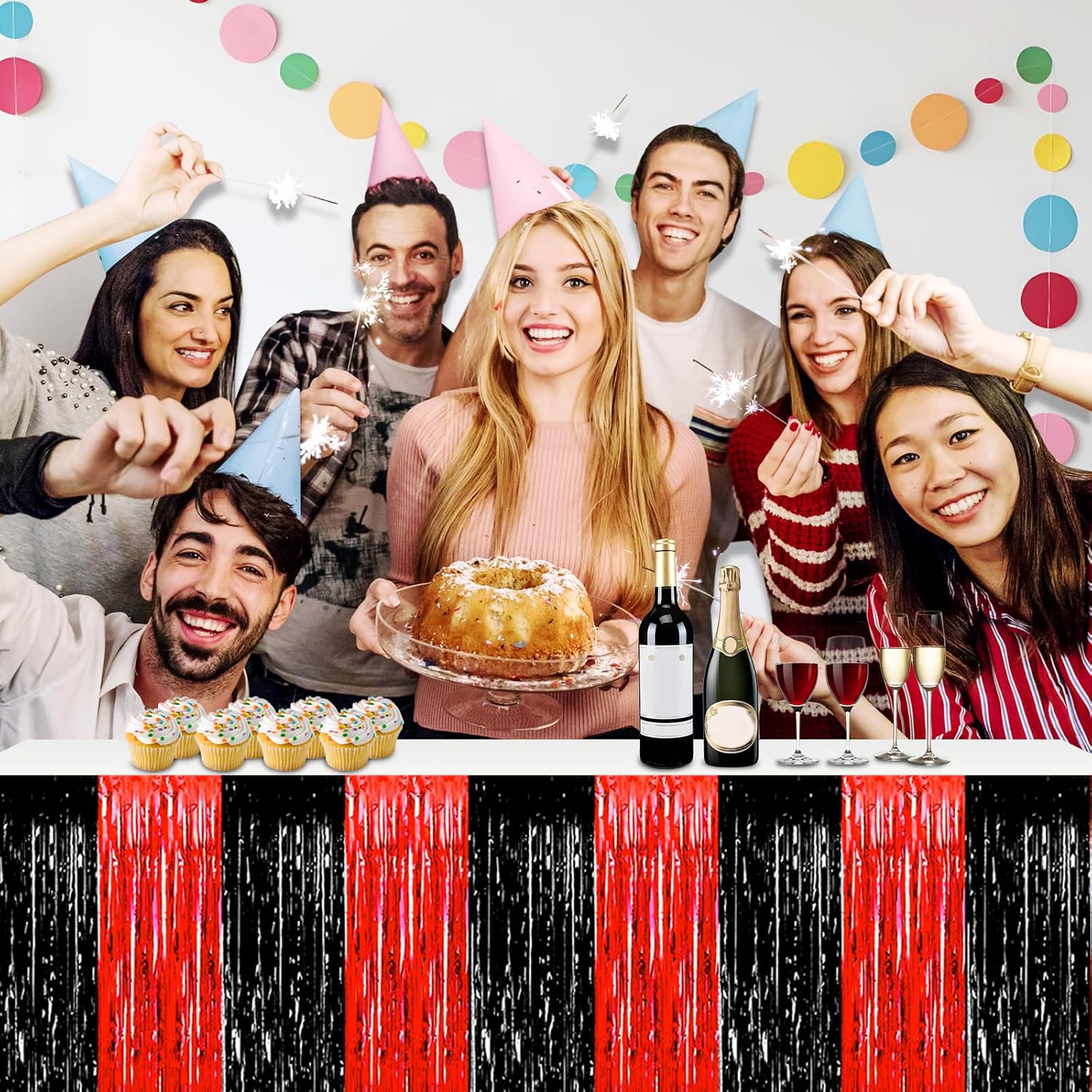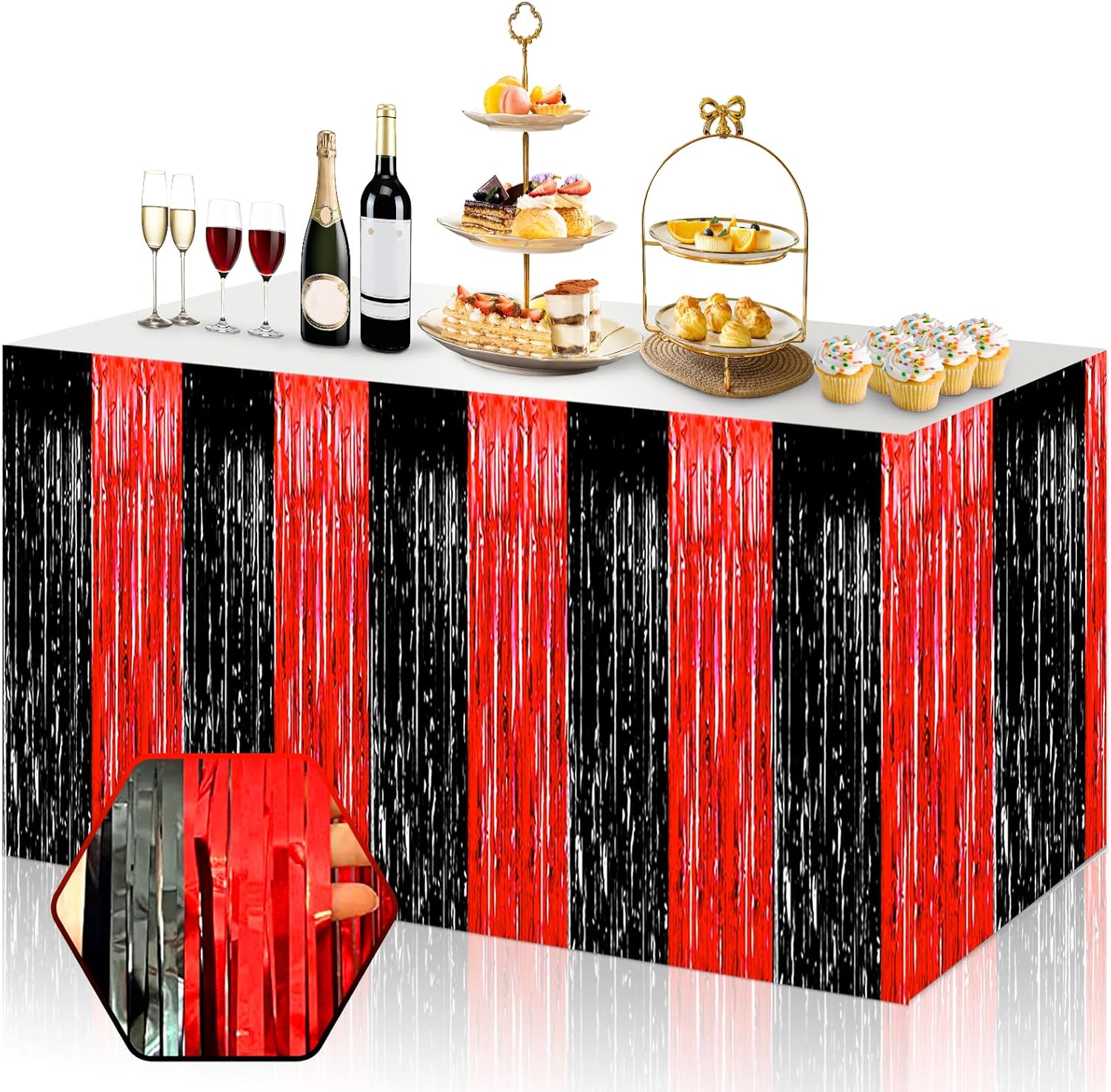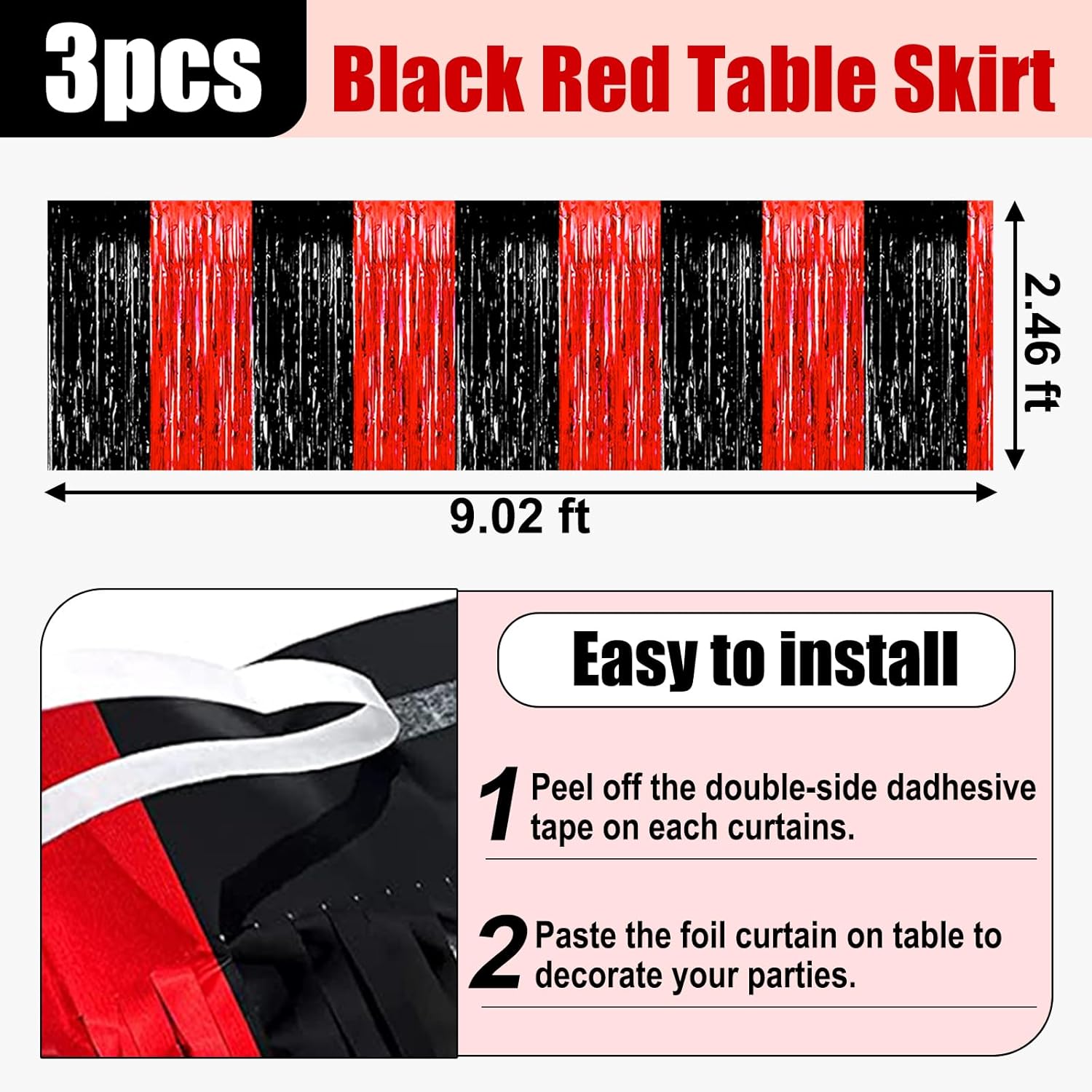 3 Pack 29x108 Inch Black Red Foil Fringe Table Skirts Metallic Banner for Tinsel Streamer Garland Backdrop for Parade Floats Wedding Thanksgiving Birthday Christmas Halloween Party Decoration
