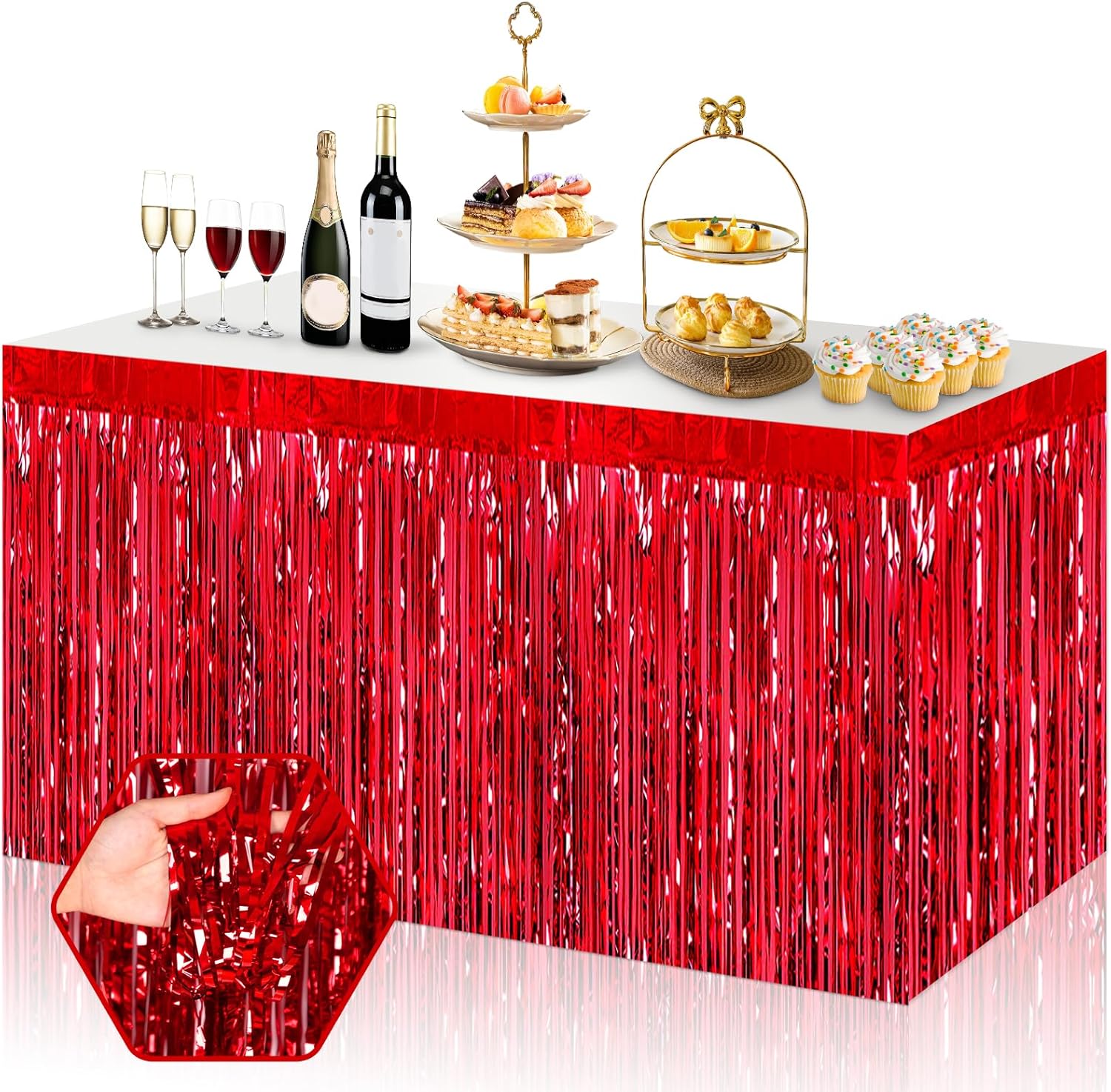 - Specifications and dimensions:3 Packs metallic foil tassel table skirt 29x108 inches, which is enough to decorate your party, provide you with excellent Convenient installation: the table skirt is equipped with self-adhesive tape. Just tear off the tape and paste it. The installation is convenient and quick. It can be pasted on the edge of your round table and square table. It can be easily cut into any siz.