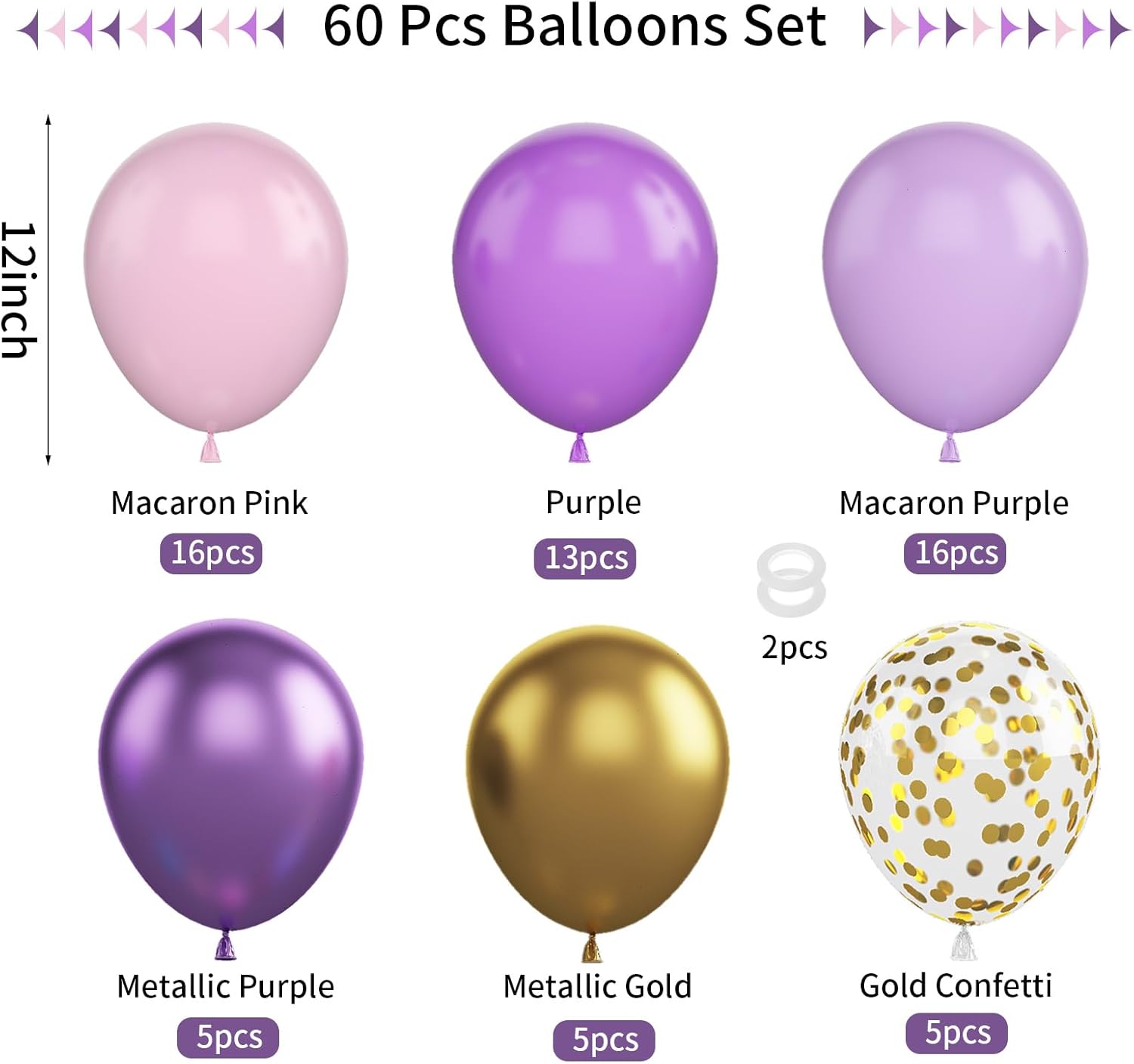 - Package Included : Our pink and purple birthday balloons set includes: 16 pcs pastel purple balloons, 16 pcs pink balloons, 13 pcs purple balloons, 5 pcs metallic purple balloons, 5 pcs gold balloons, 5 pcs gold confetti balloons and 2 pcs white ribbons
