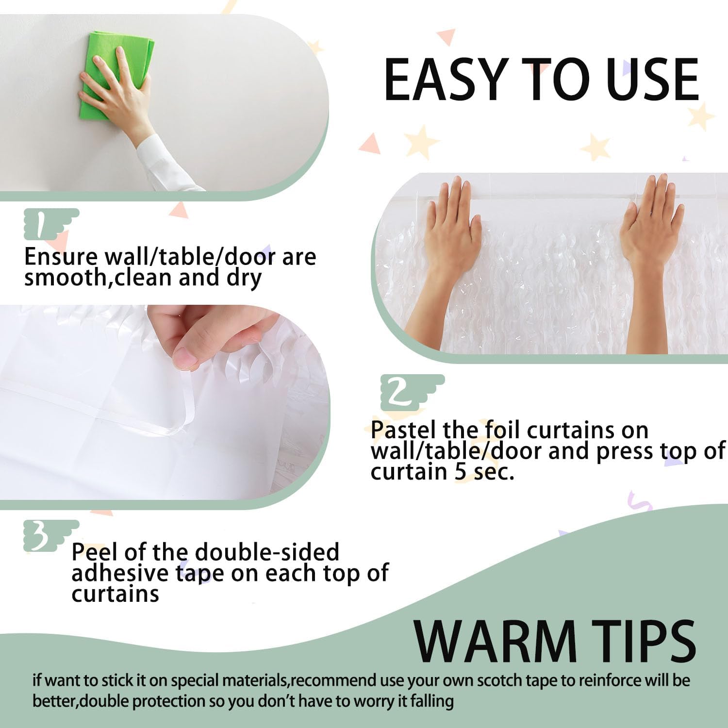- Package Included: 3 packs white fringe curtain, the size of 3.3*6.6ft,It's long enough to fit any occasion,Please do not stick the foil curtain on uneven or stained walls to prevent it from falling off!!!