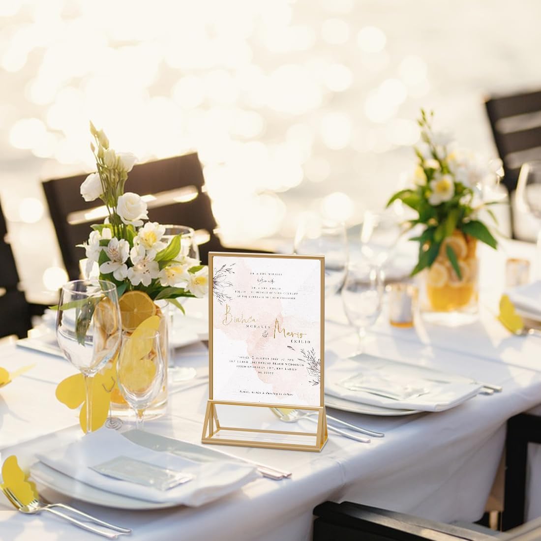 12 Pack Acrylic Sign Holder 5x7 Gold Frame Double Sided Display Stand, Clear Sign Holder Table Plastic Paper Holder, Acrylic Frames for Home Office Shop Photo Frames