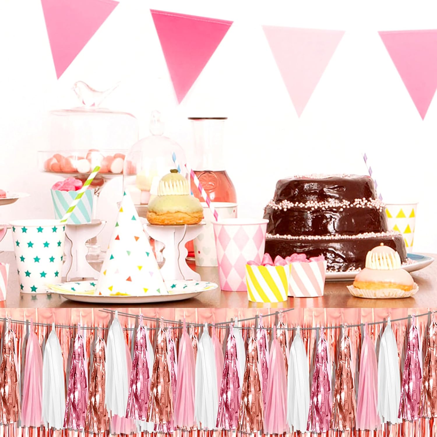 - 【Pink White Peach Rose Gold Party Supplies Set】: The total length of the pink white peach rose gold birthday tassels banner is 59 feet, divided into 4 strips, each 9.8 feet long. Each banner contains 15 tassels, and each tassel measures 14 inches, for birthday decorations many occasions, and so on