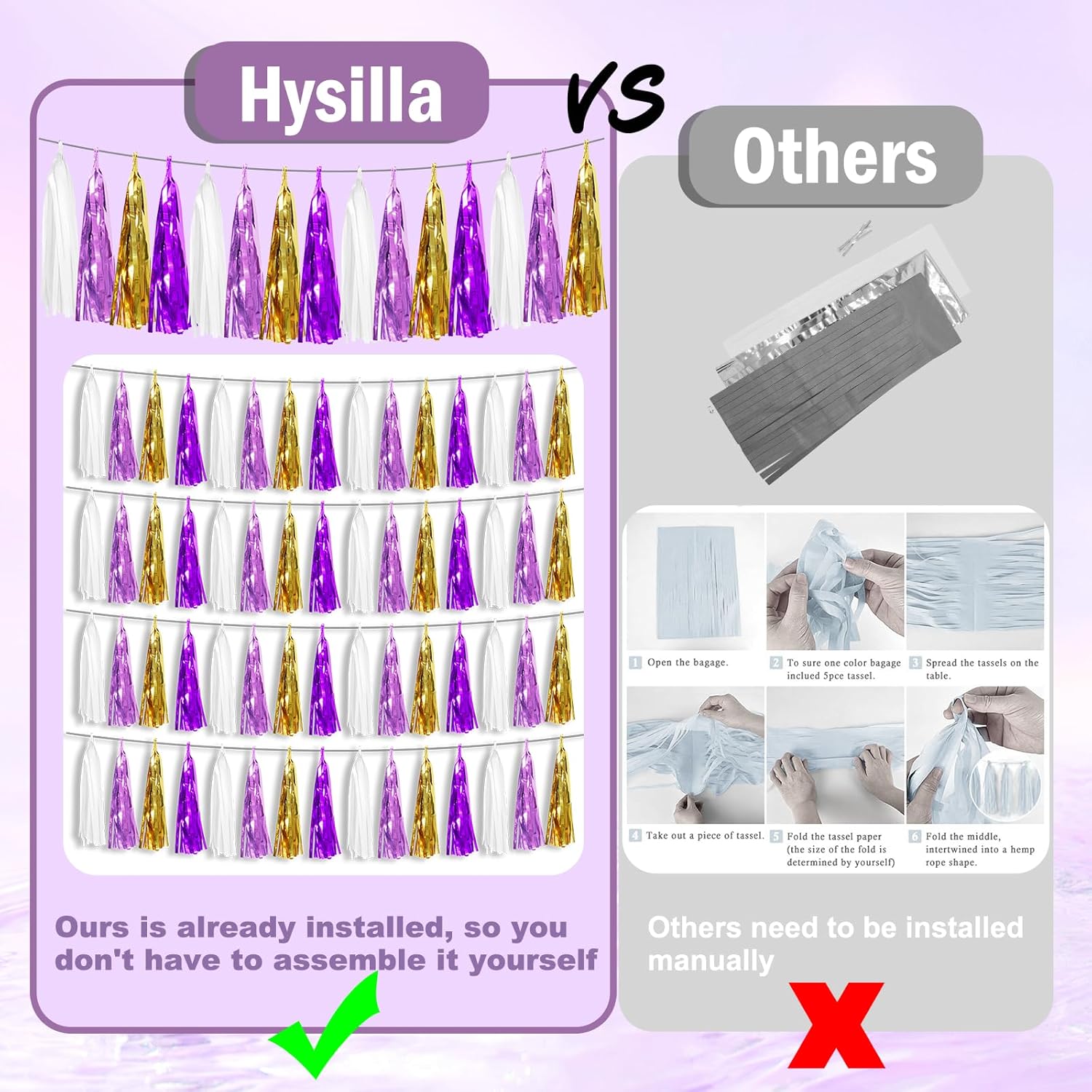 - 【White Light Purple Purple Gold Party Supplies Set】: The total length of the white light purple purple gold birthday tassels banner is 59 feet, divided into 6 strips, each 9.8 feet long. Each banner contains 15 tassels, and each tassel measures 14 inches, for birthday decorations many occasions, and so on