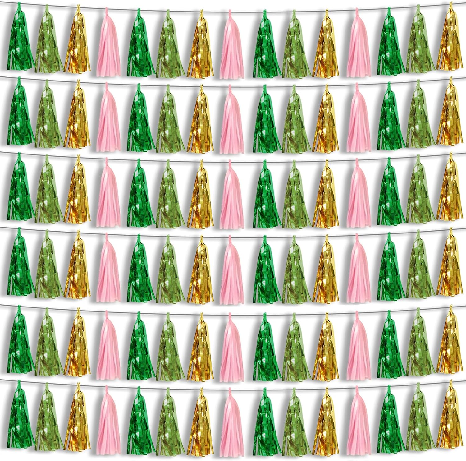 - 【Perfect Party Decoration】The sage green pink gold tinsel garlands are designed in a metallic Fringe, bright, and beautiful, at the same time, they shine in the sun, and these gorgeous tassel garlands create a wonderful backdrop or centerpiece for your party space. and bring you, your family, and your friend's good Visual effects. your party many emotional and touching moments where a lot of pictures will be taken and everybody will have a wonderful time together.