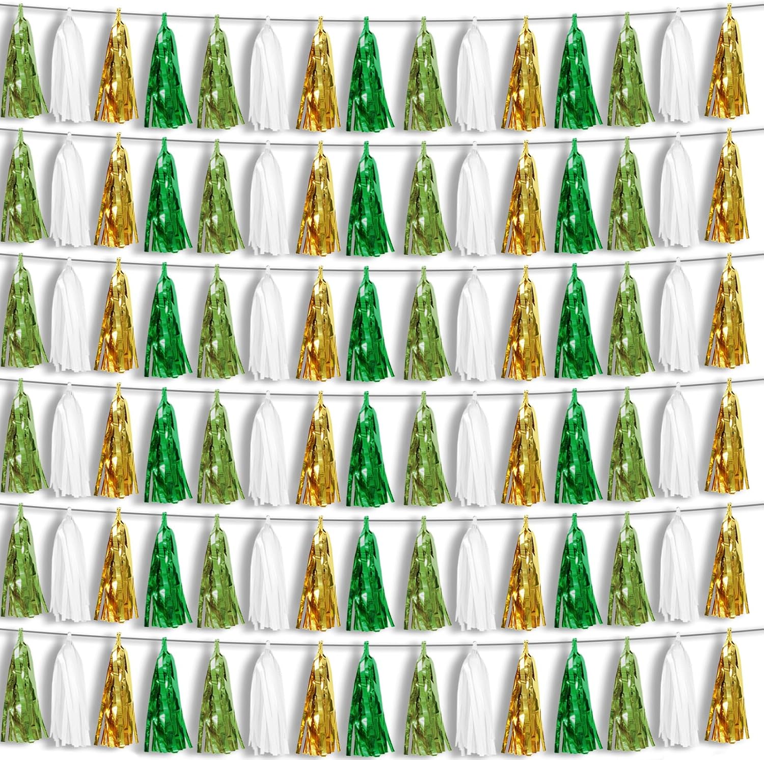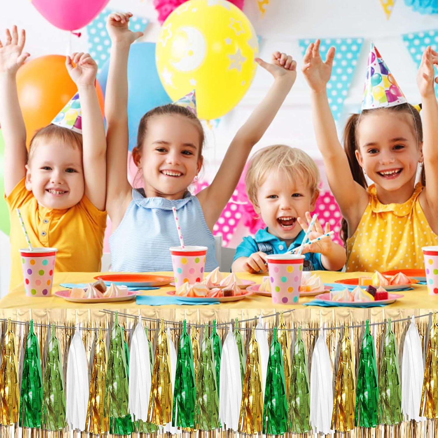 - 【Light Green White Gold Green Party Supplies Set】: The total length of the Light Green White Gold Green birthday tassels banner is 59 feet, divided into 6 strips, each 9.8 feet long. Each banner contains 15 tassels, and each tassel measures 14 inches, for birthday decorations many occasions, and so on