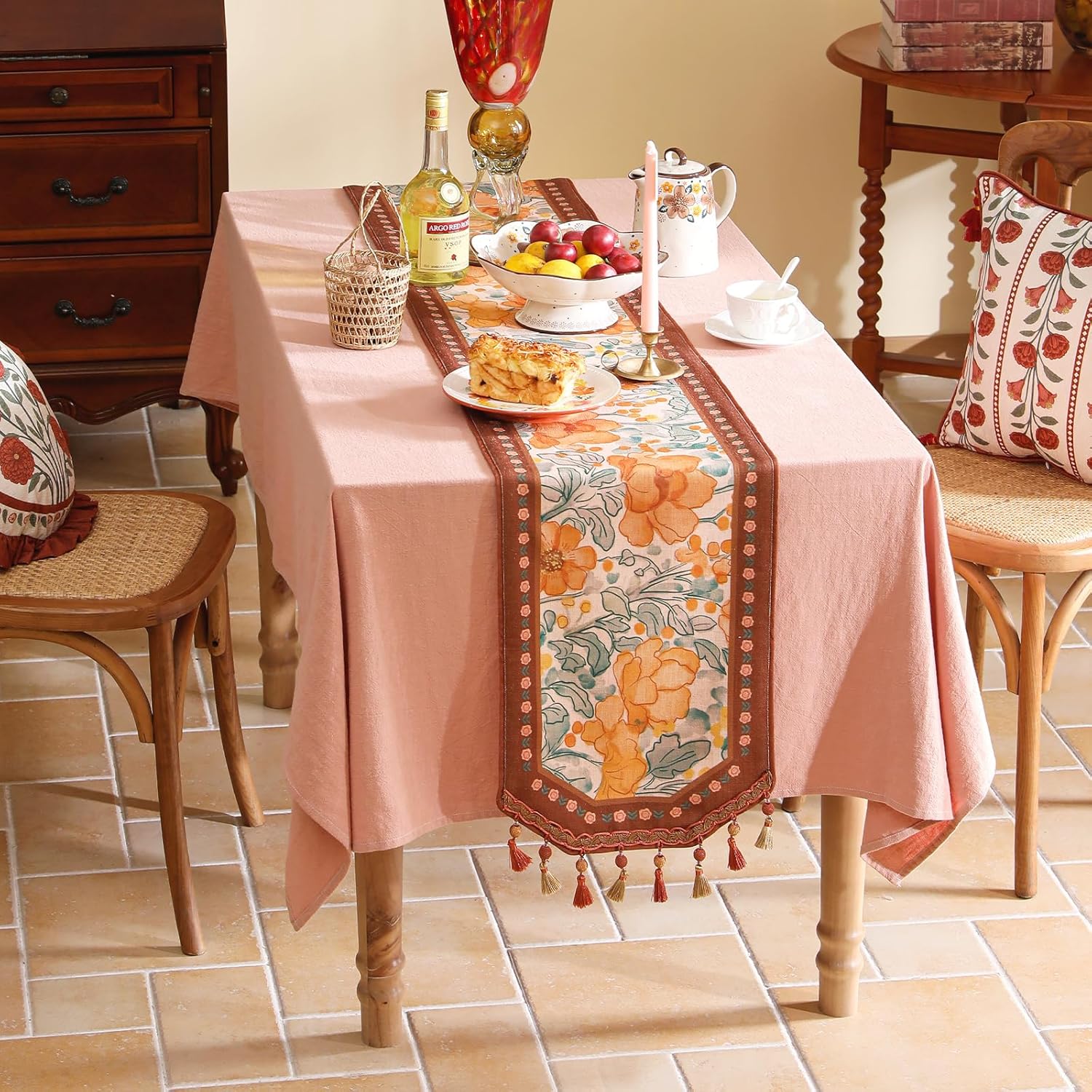 Designer Vintage Orange Floral Table Runner,French Soft Linen Farmhouse Table Runners 71 Inches Long,Decor Tabletop for Kitchen,Dining,Tea Party,Home,Christmas,12"*71"