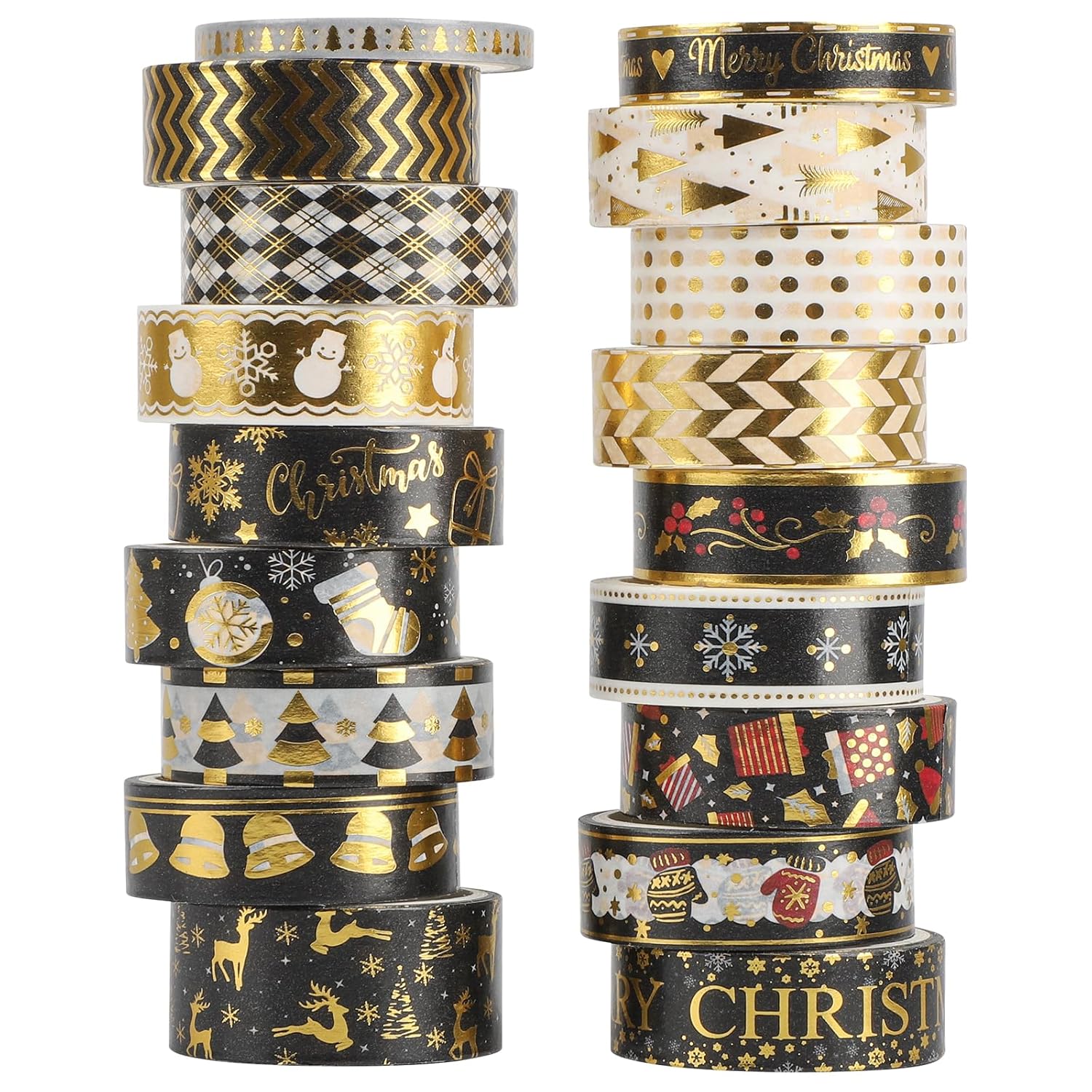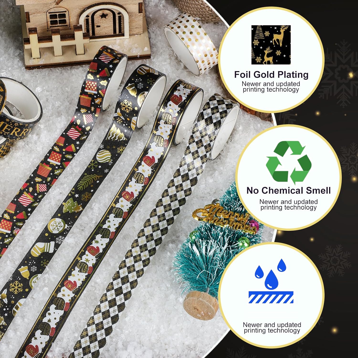 - Gold Silver Foil Decorative Tape: Printed with many kinds of patterns, such as Jingle Bells,Christmas Stockings, snowflakes, elk, Christmas tree and so on, bringing you a joyful festival atmosphere.