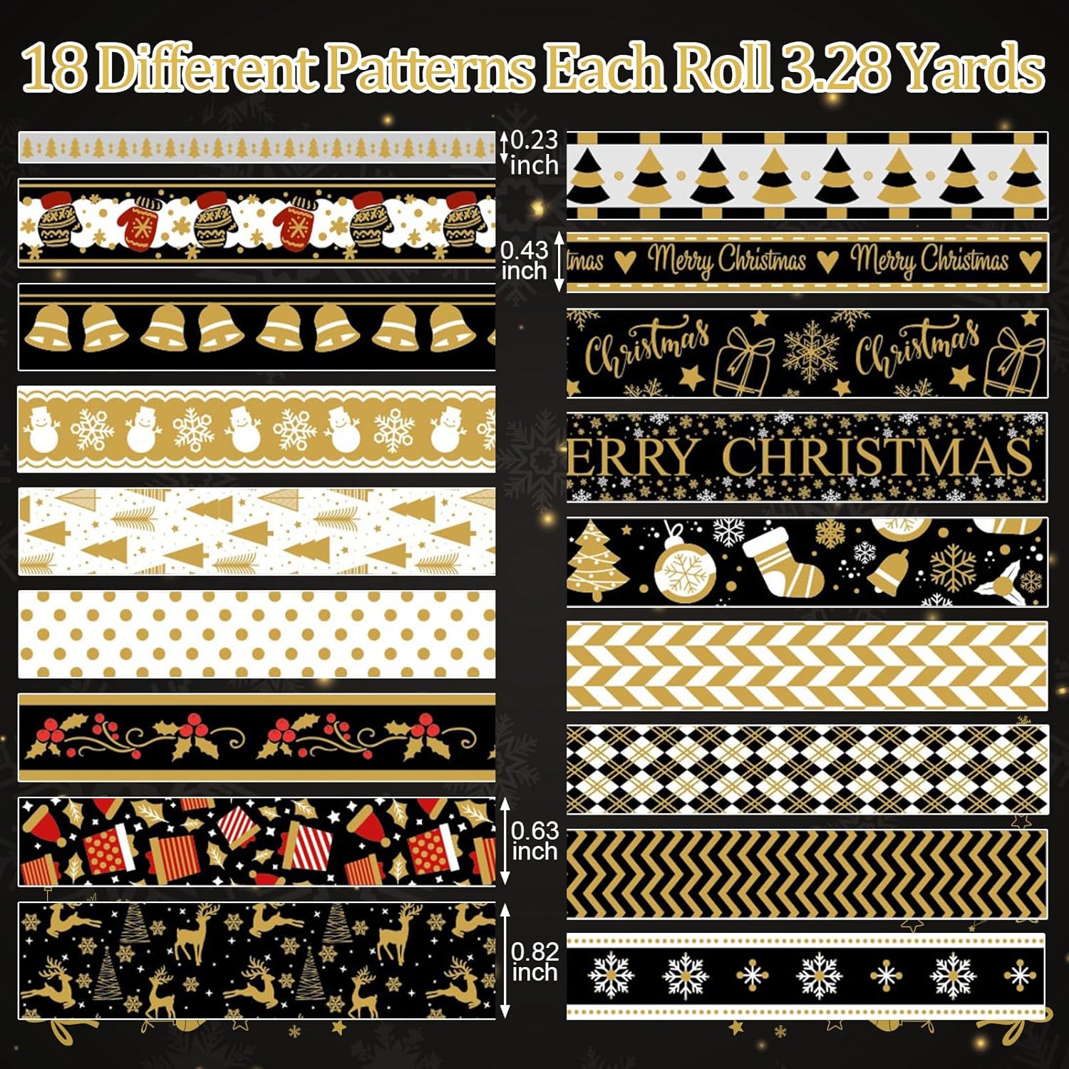 18 Rolls Christmas Washi Tape Holiday Masking Tape Black Christmas Wrapping Tape Glod Silver Foil Decorative Tape for Christmas Scrapbook Journal DIY Craft Gift Wrapping(Xmas Black