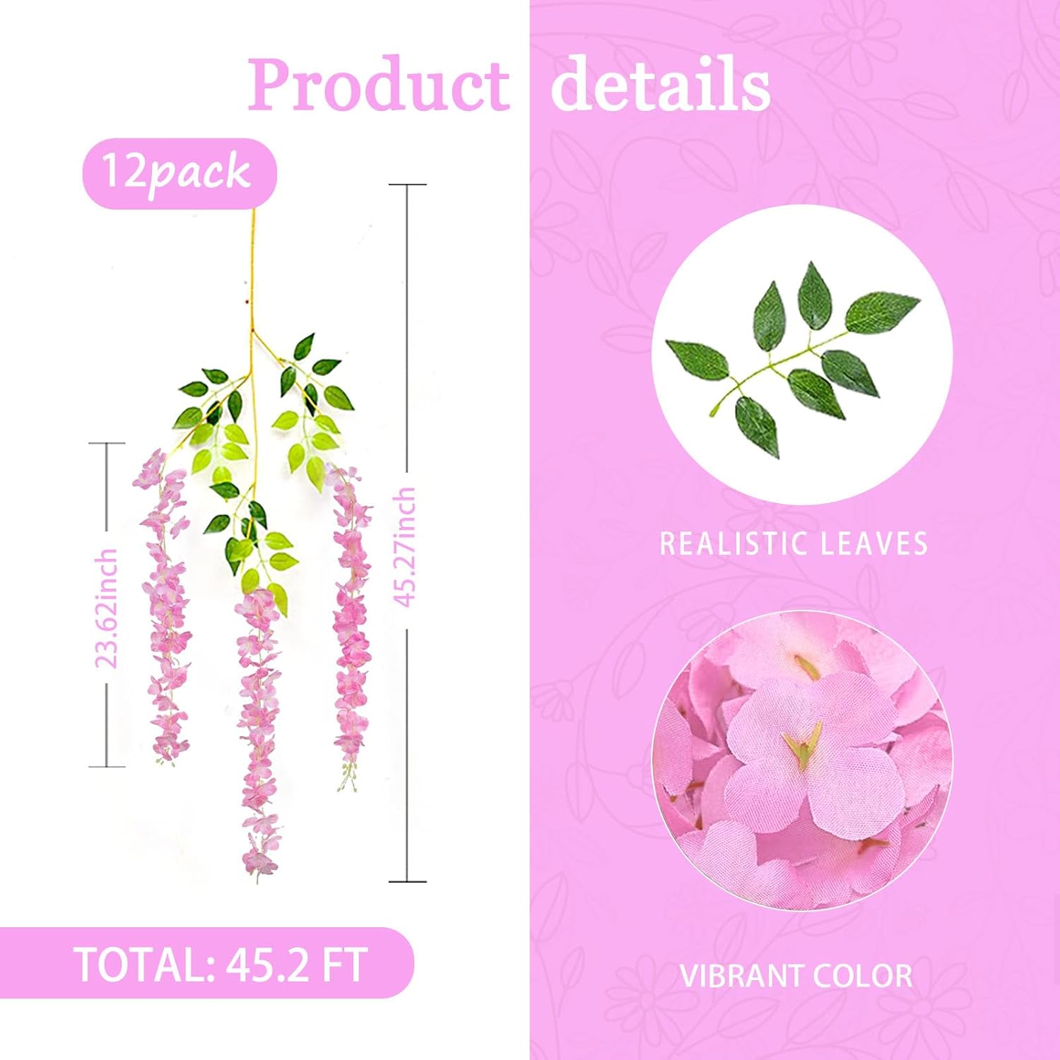 - 【Package Included】12 pieces of silk pink wisteria hanging flowers, each length 45.27 inches. Every artificial wisteria garland has 3 branches and 6 leaves, the wisteria flower petal length is 23.62 inches. (Note: There may be some color differences in different lights)
