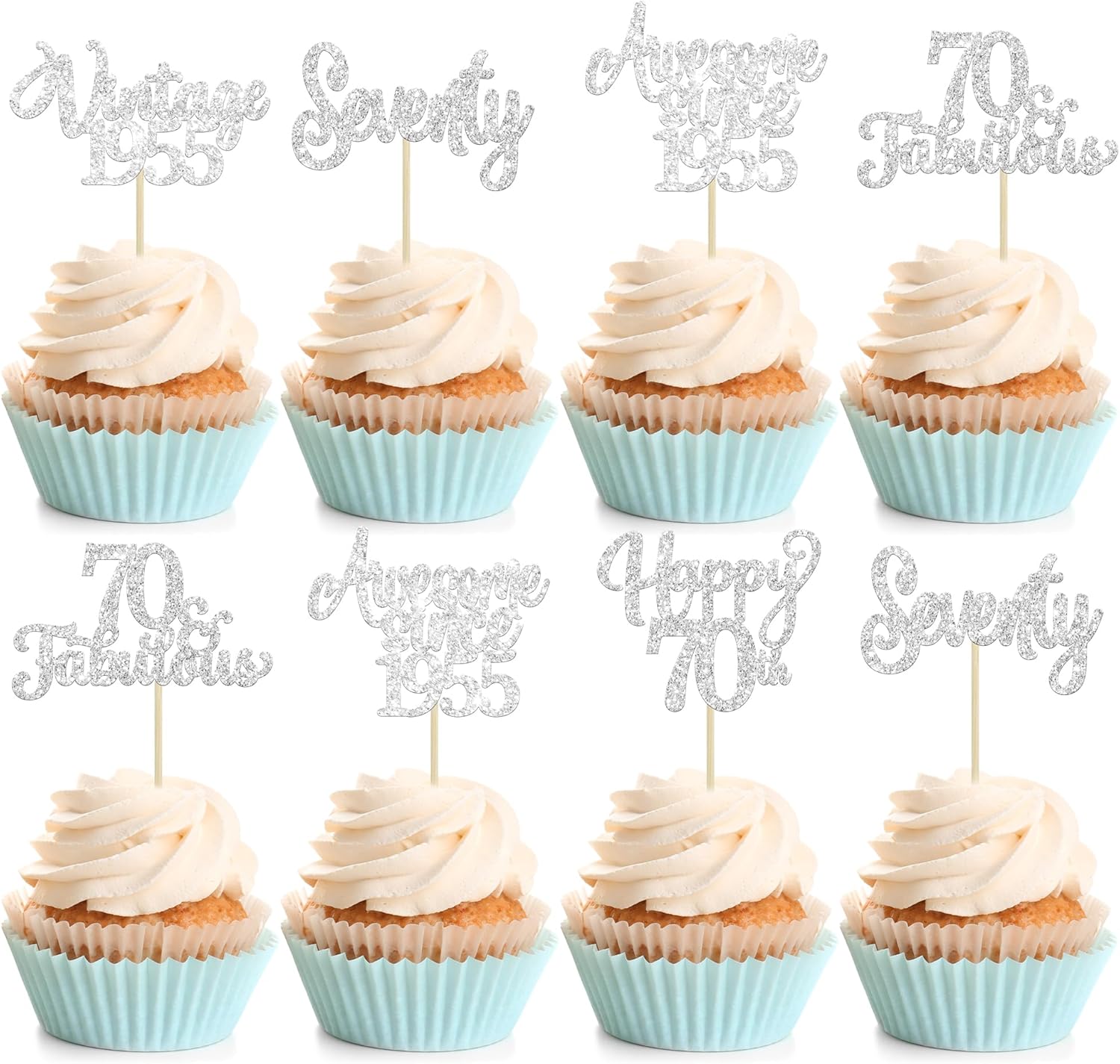 30Pcs Happy 70th Birthday Cupcake Toppers Glitter Seventy Vintage 1955 Cupcake Picks Cheers to 70 Fabulous Cake Decorations for 70th Birthday Wedding Anniversary Party Supplies Silver