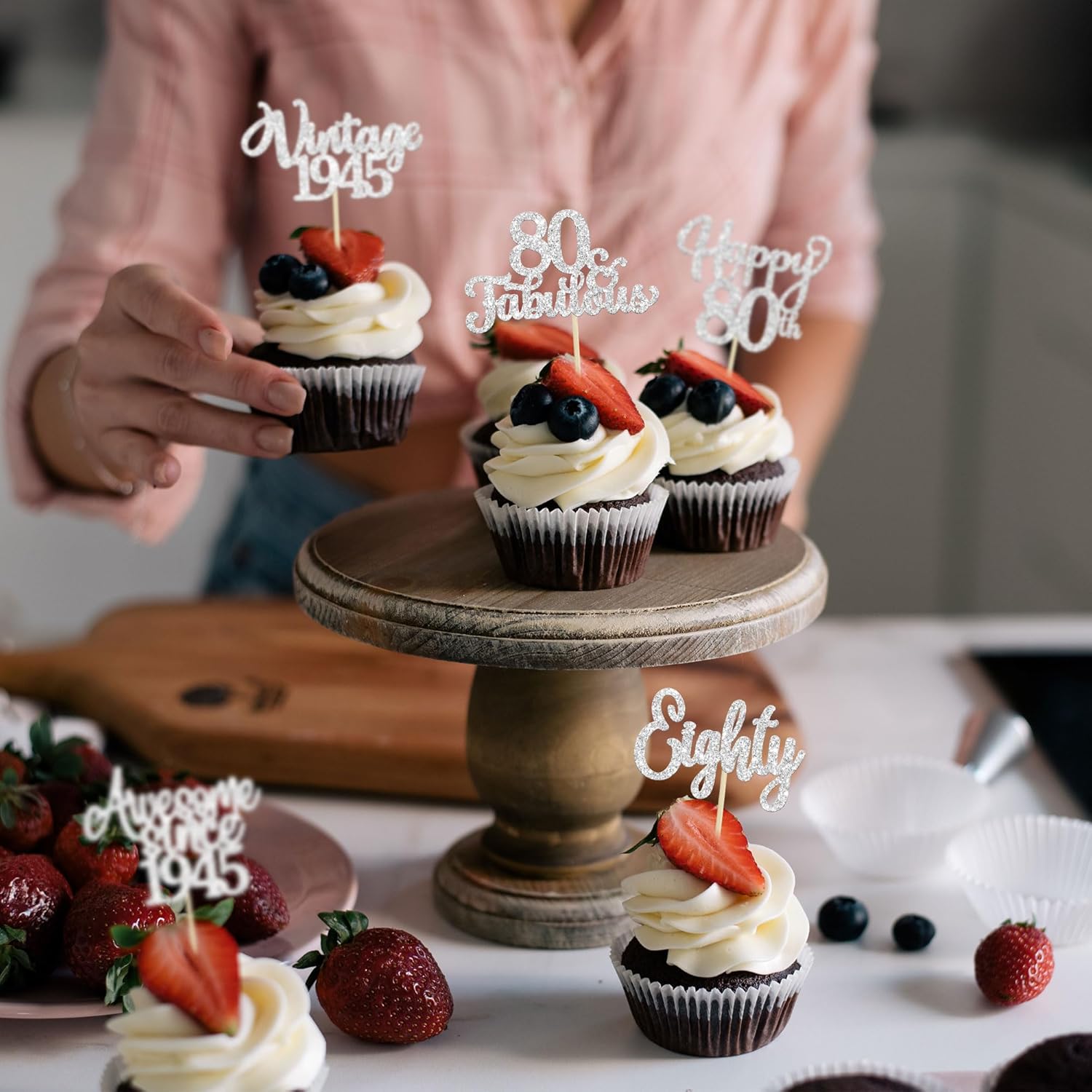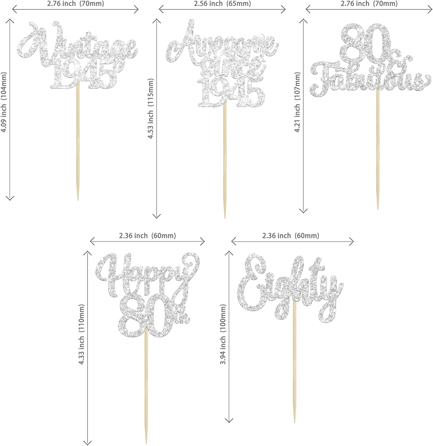 30Pcs Happy 80th Birthday Cupcake Toppers Glitter Awesome Since 1945 Eighty 80 Fabulous Vintage 1945 Cupcake Picks for 80th Birthday Anniversary Retirement Party Cake Decorations Supplies Silver