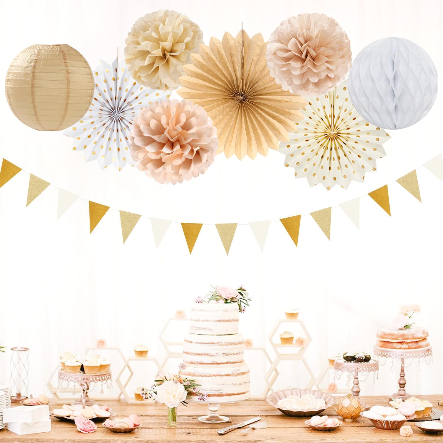 - [Package Includes] Beige champagne gold white peach boho party decorations kit contains: 1 x triangle bunting, 4 x paper fans, 9 x tissue pom poms, 2 x honeycomb balls, 4 x paper lanterns, a total of 20 pieces of various sizes of decorations. Better embellish your party.