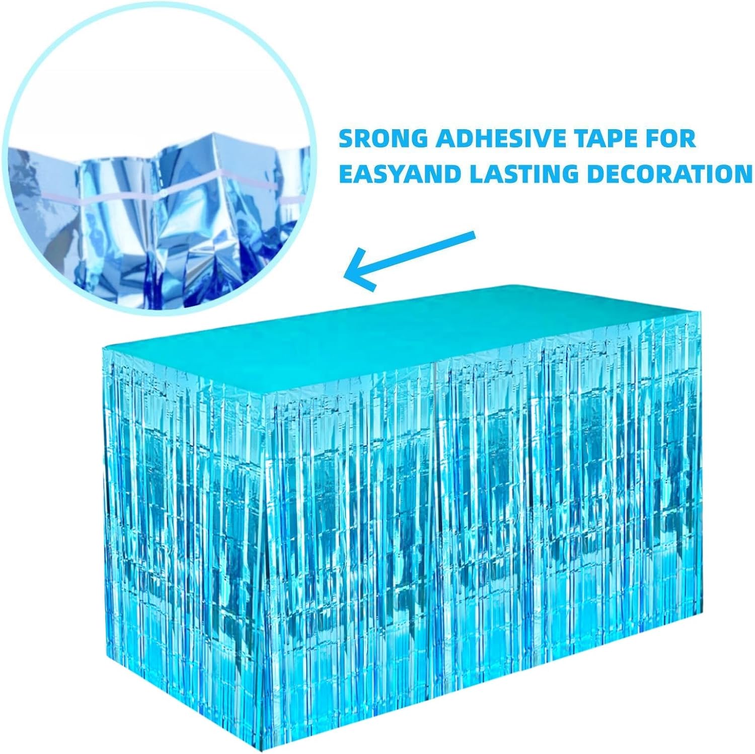 - 【RELIABLE SHINY FOIL TABLE SKIRT】Metallic tassel table skirt are made of aluminum foil with sequins, making the foil table skirt more shiny and beautiful, making the party more complete! They can stay stuck on very well, with smooth surface, great for your party venue decoration