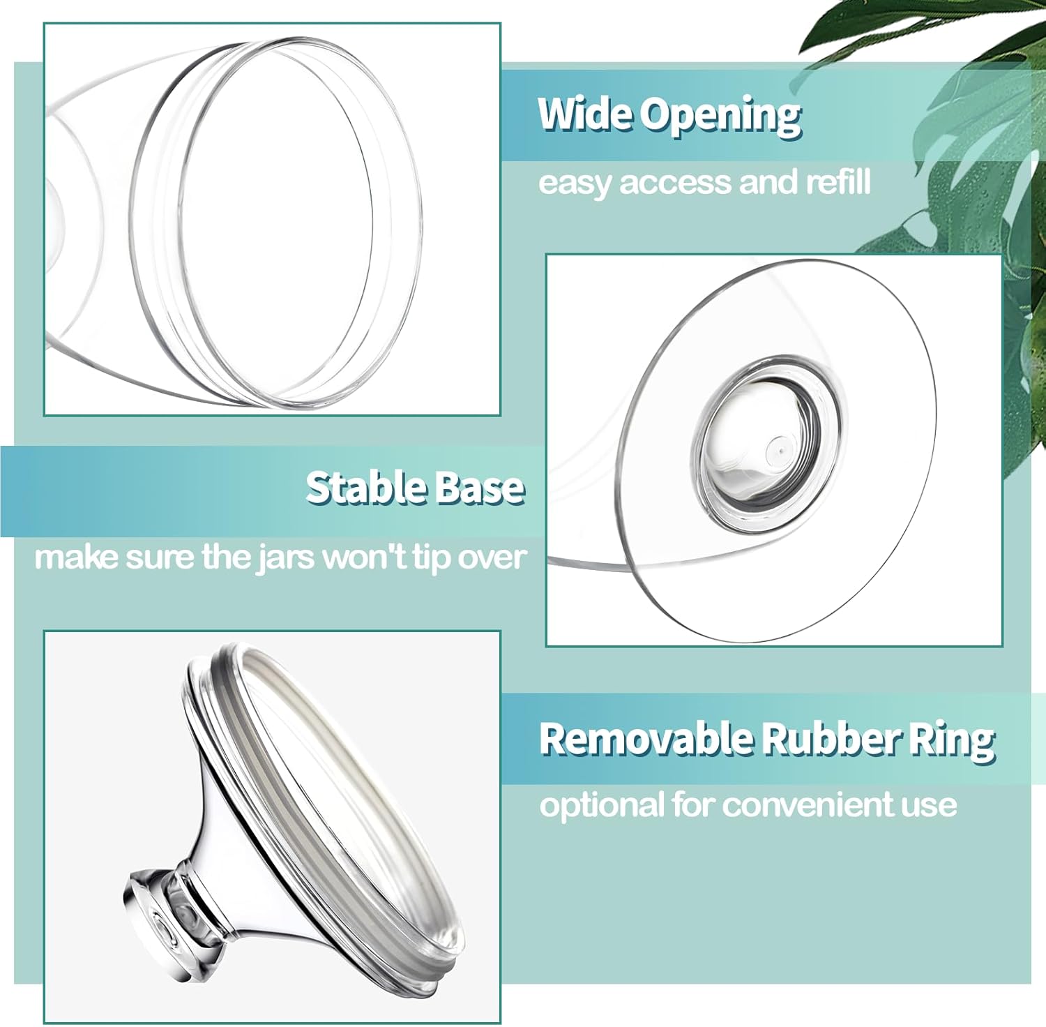 - SOLID CONSTRUCTION: The jars feature a wide mouth, which makes them easy to access and refill essentials while the thickness and wide base enhance the durability and stability; Each lid comes with a removable rubber ring to keep the storage contents dry and fresh