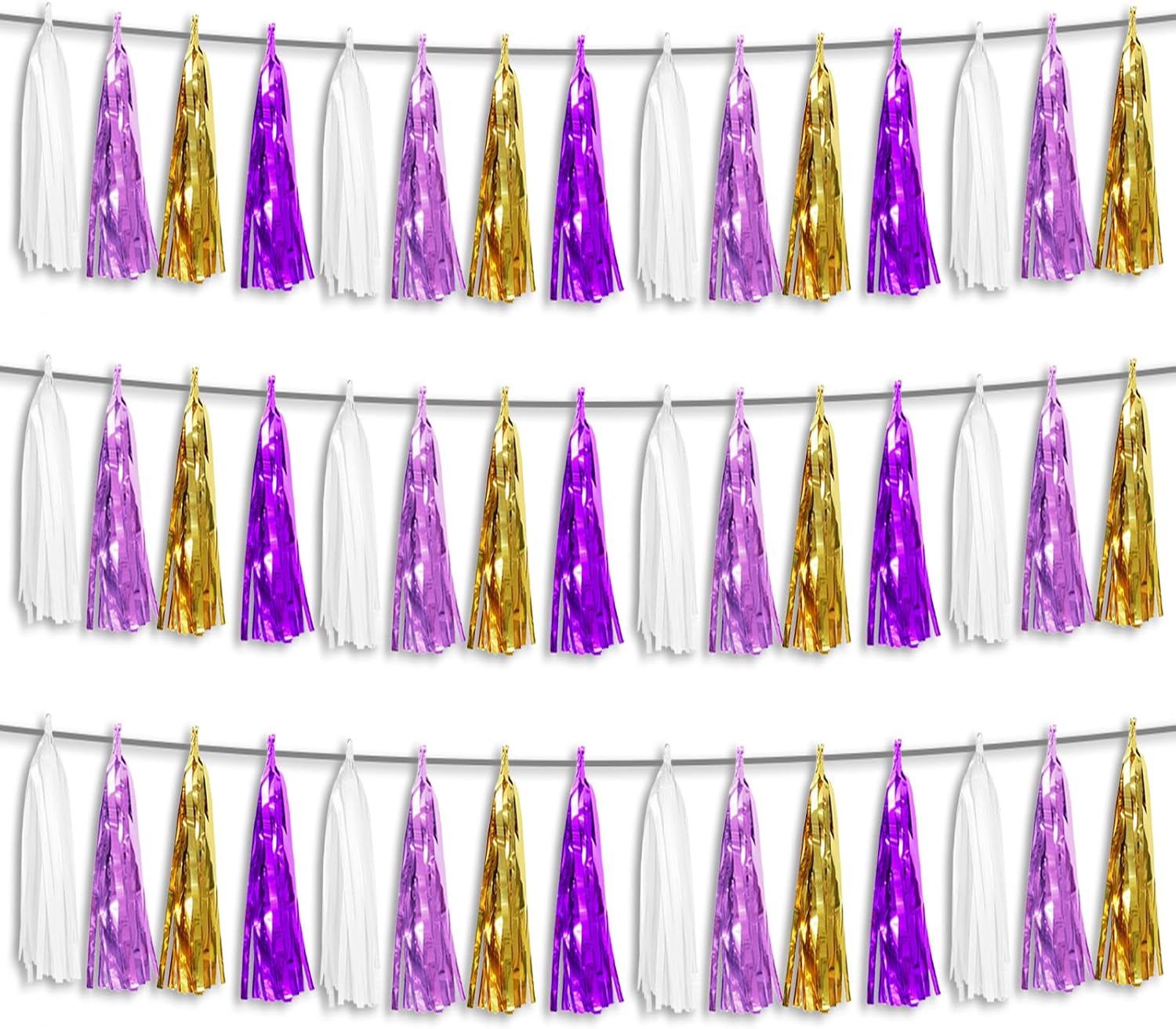- 【White Light Purple Purple Gold Party Supplies Set】: The total length of the white light purple purple gold birthday tassels banner is 29.5 feet 45tassels, divided into 3 strips, each 9.8 feet long. Each banner contains 15 tassels, and each tassel measures 14 inches, for birthday decorations many occasions, and so on