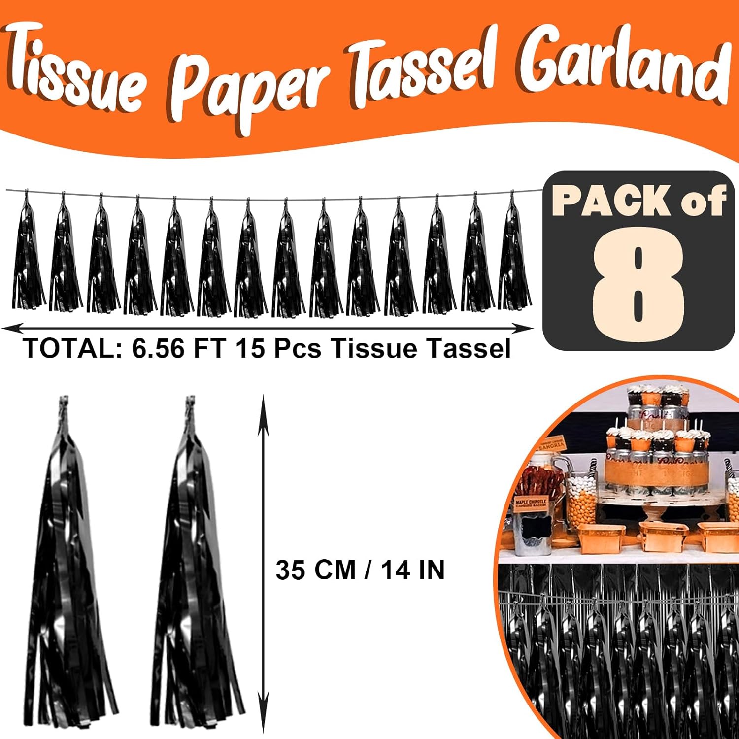 8P Black Foil Fringe Metallic Tassel Streamers Banner Tassel Garland for Parade Floats, Bachelorette, Wedding, Birthday, Halloween, Christmas, Bridal/Baby Shower Party Decorations