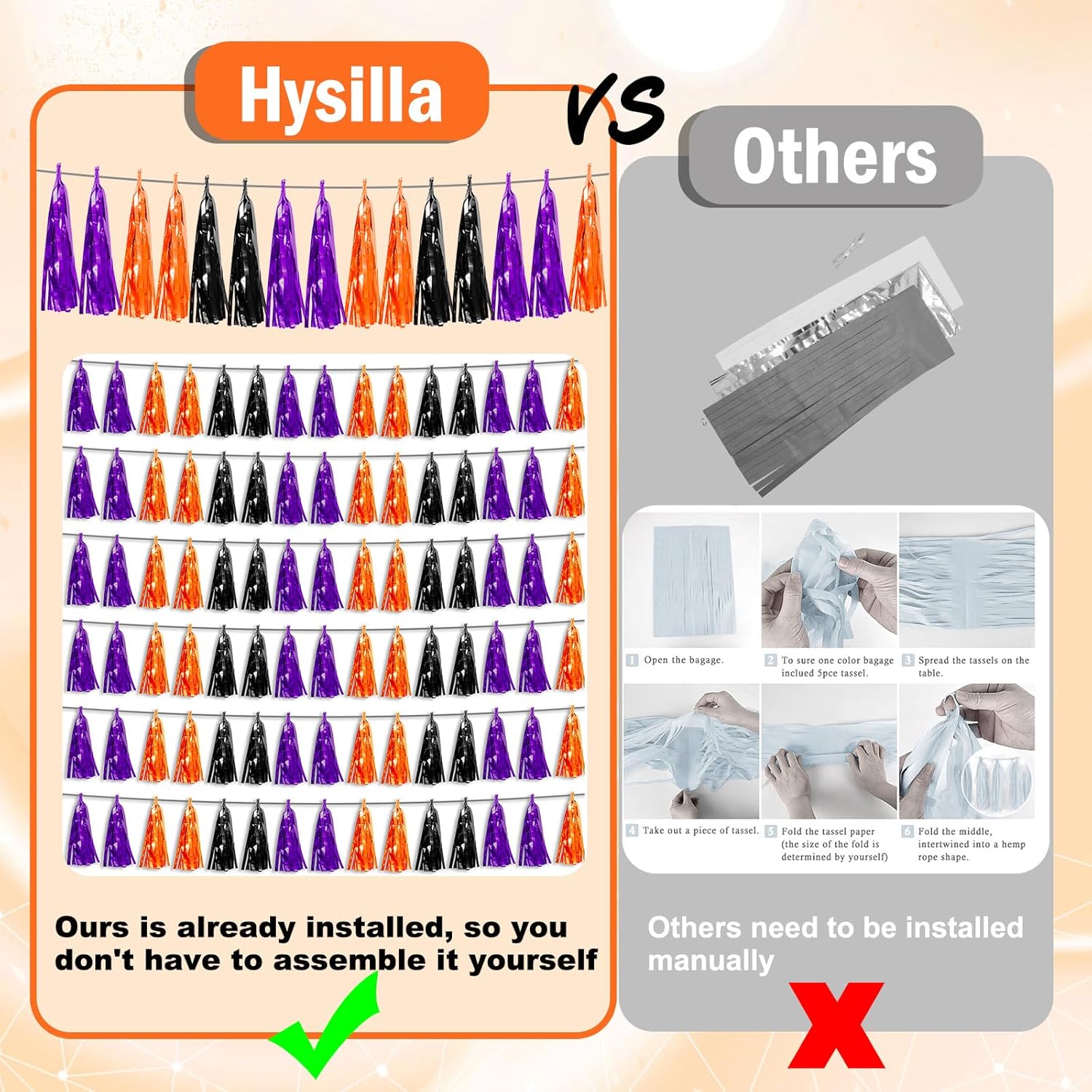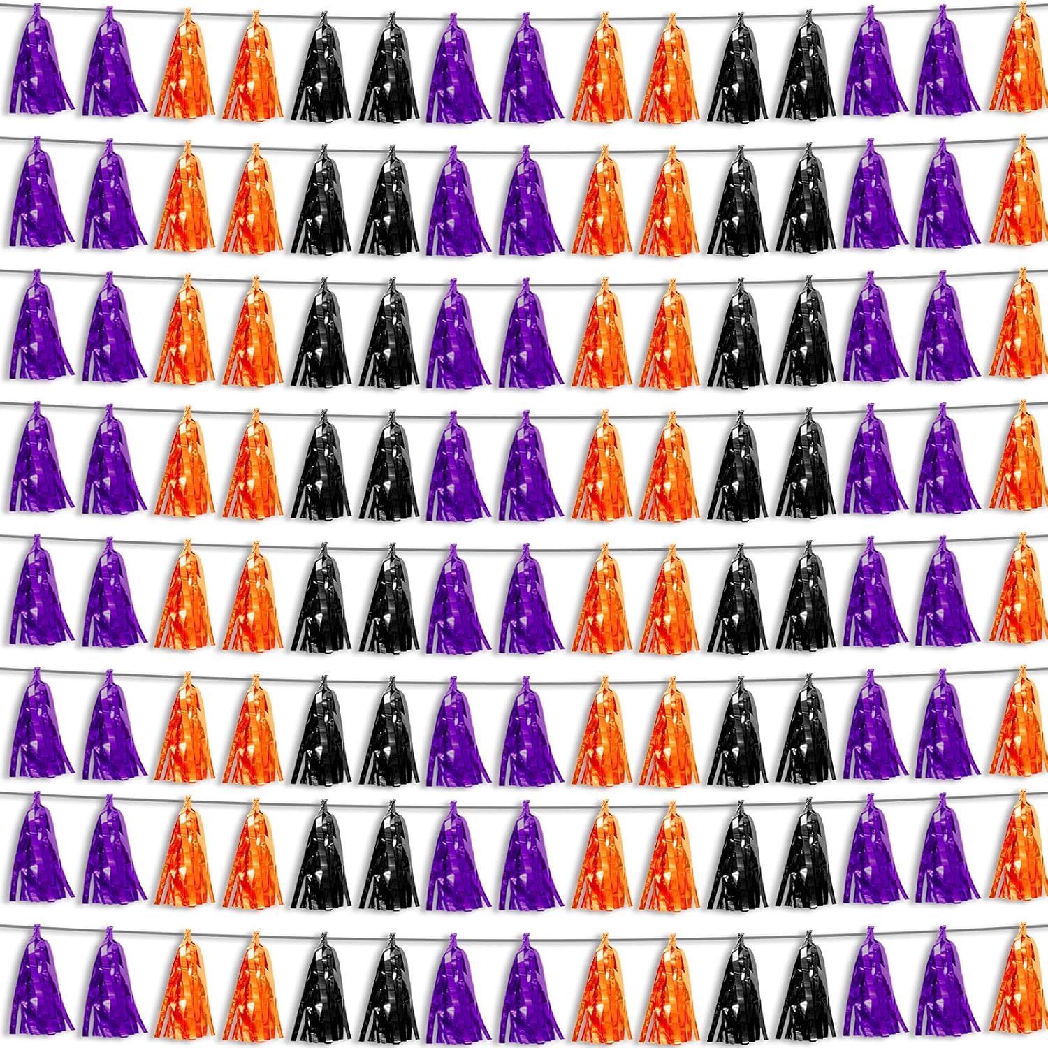- 【Purple Black 0range Party Supplies Set】: The total length of the Purple Black 0range birthday tassels banner is 78.7 feet 120tassels, divided into 8 strips, each 9.8 feet long. Each banner contains 15 tassels, and each tassel measures 14 inches, for birthday decorations many occasions, and so on