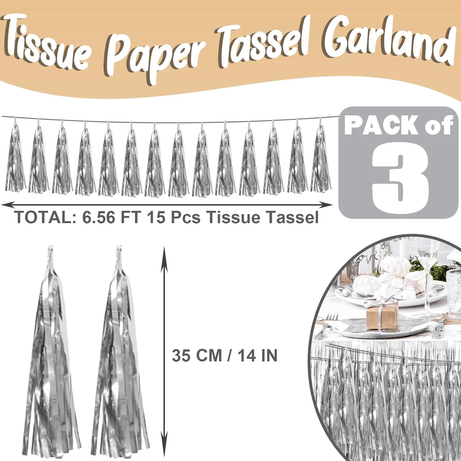 - 【Silver Party Supplies Set】: The total length of the silver birthday tassels banner is 29.5 feet 45tassels, divided into 3 strips, each 9.8 feet long. Each banner contains 15 tassels, and each tassel measures 14 inches, for birthday decorations many occasions, and so on