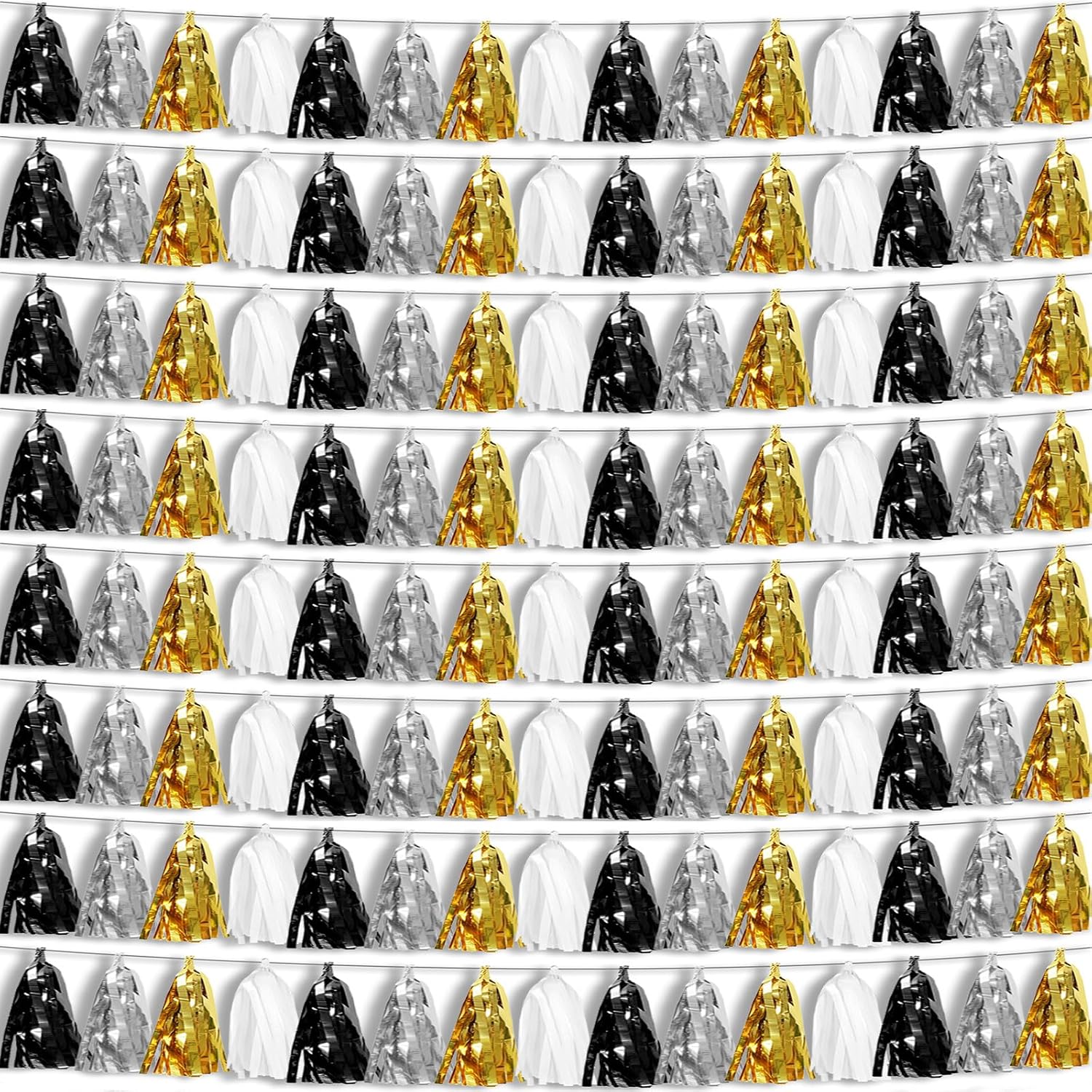 - 【Black Silver Gold White Party Supplies Set】: The total length of the Black Silver Gold White birthday tassels banner is 78.7 feet 120tassels, divided into 8 strips, each 9.8 feet long. Each banner contains 15 tassels, and each tassel measures 14 inches, for birthday decorations many occasions, and so on