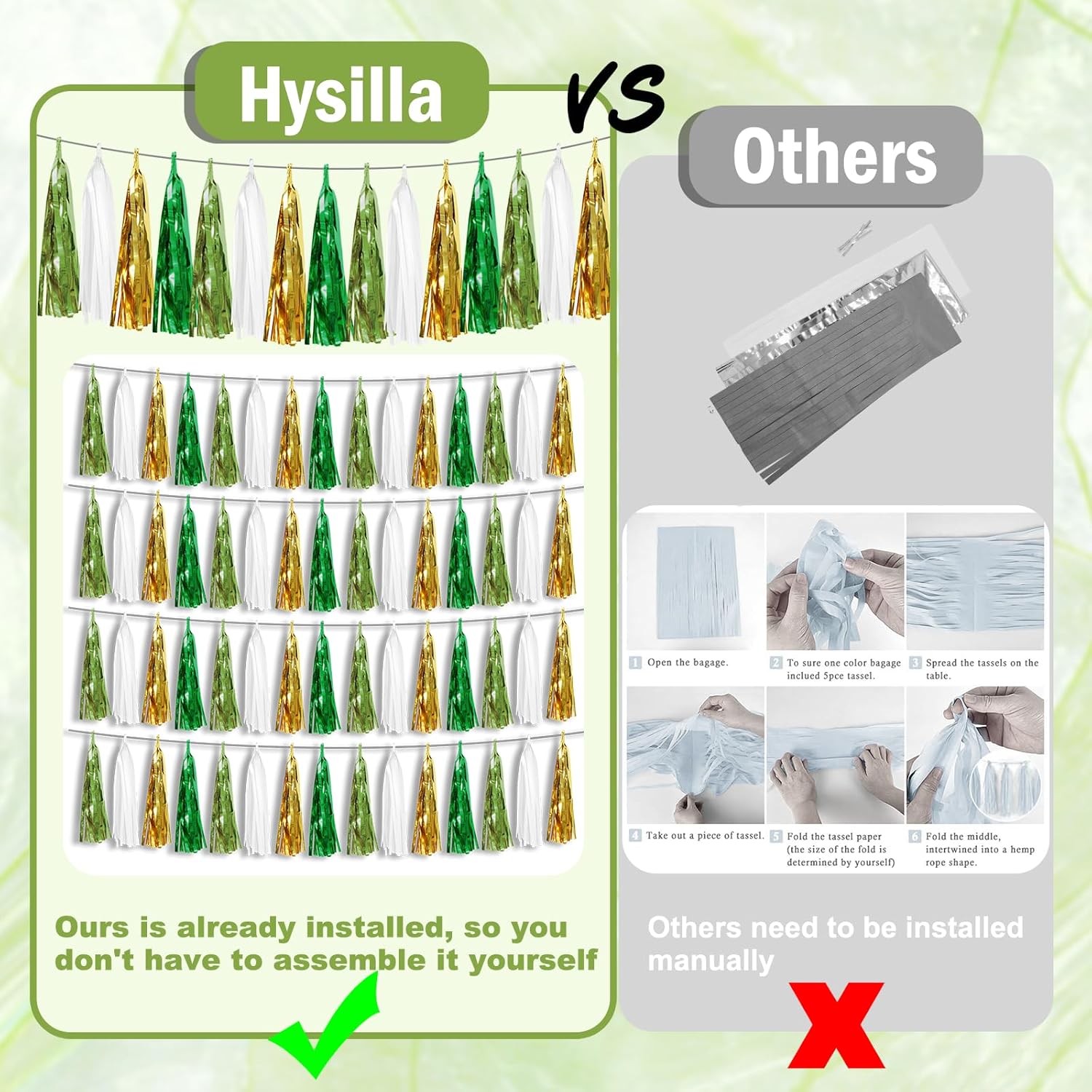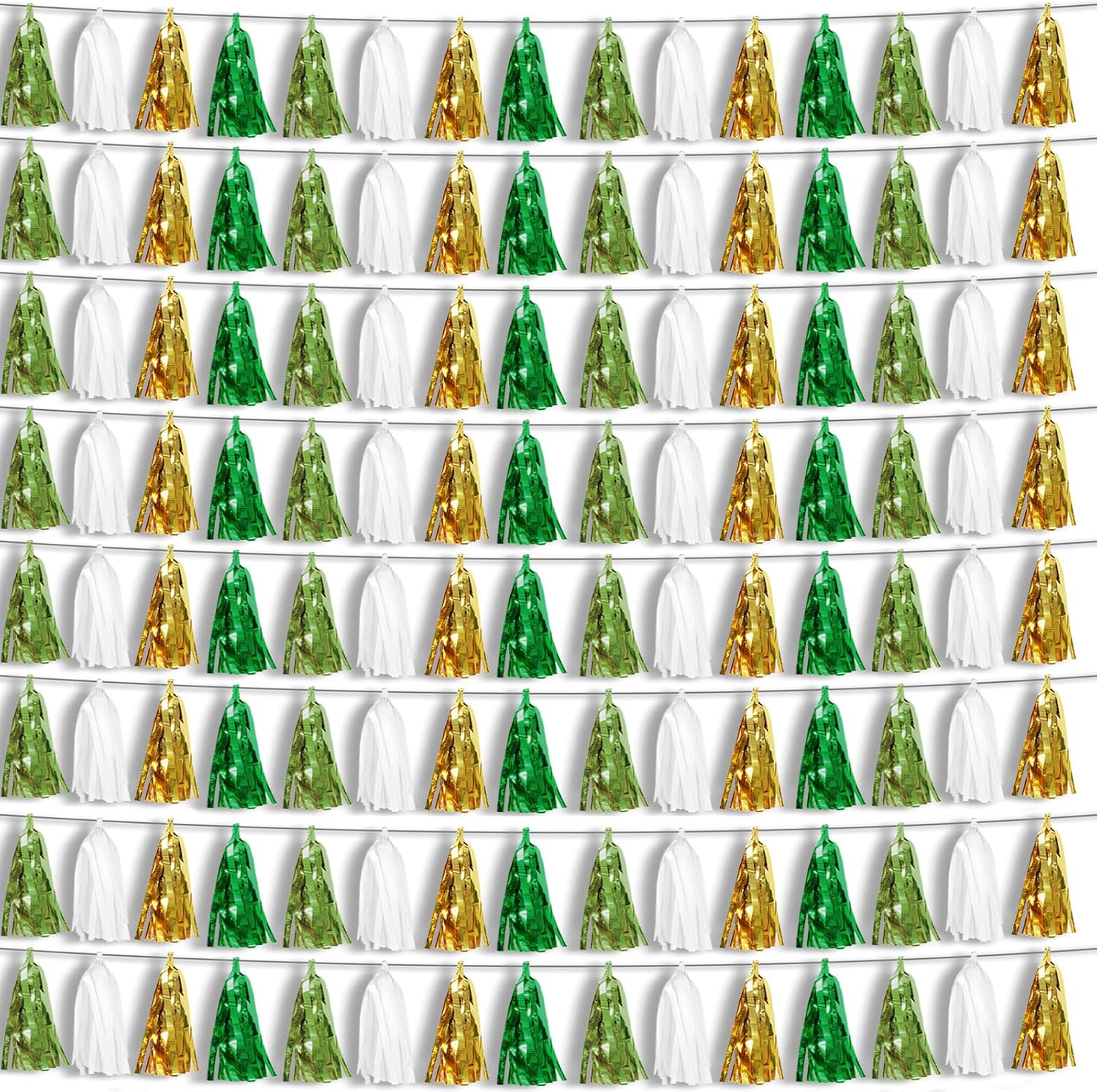 - 【Light Green White Gold Green Party Supplies Set】: The total length of the Light Green White Gold Green birthday tassels banner is 78.7 feet 120tassels, divided into 8 strips, each 9.8 feet long. Each banner contains 15 tassels, and each tassel measures 14 inches, for birthday decorations many occasions, and so on