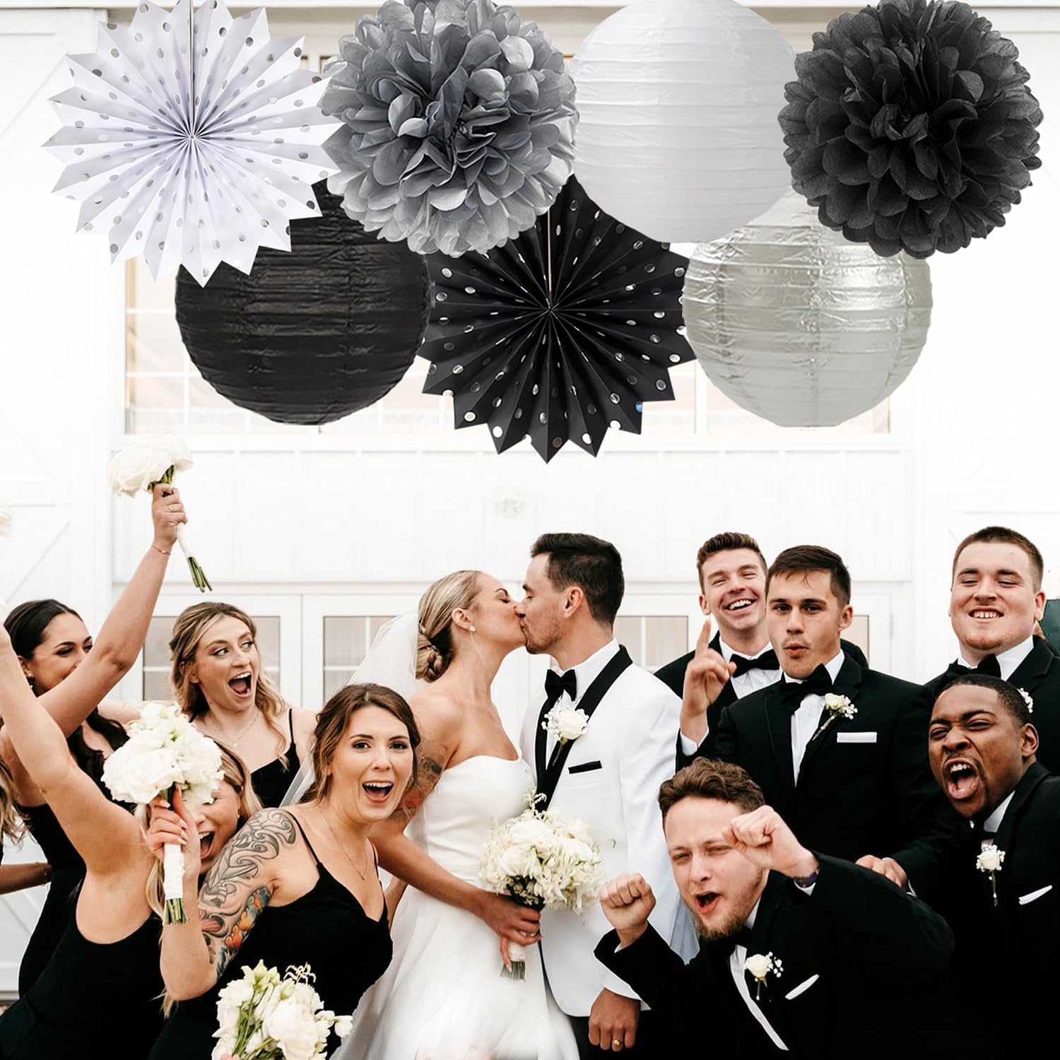 - [Package Includes] Black white silver party decorations kit contains: 1 x triangle bunting, 4 x paper fans, 9 x tissue pom poms, 2 x honeycomb balls, 4 x paper lanterns, a total of 20 pieces of various sizes of decorations. Better embellish your party.