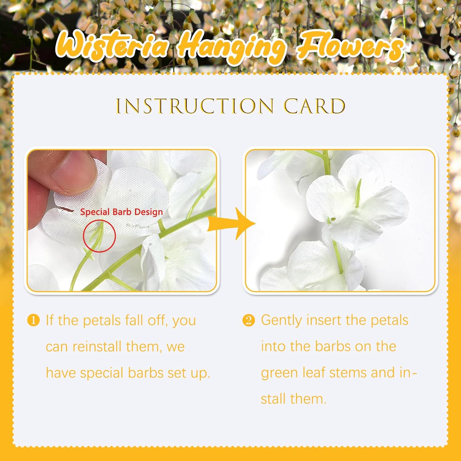 - 【Easy to Install】The orange wisteria flower vines stem are made of durable metal wire and covered with plastic. You can bend the wisteria flower in any shape to satisfy your decoration imagination without damaging it. And the wisteria flower is very easy to install and remove, you can reduce a lot of troubles on installation.