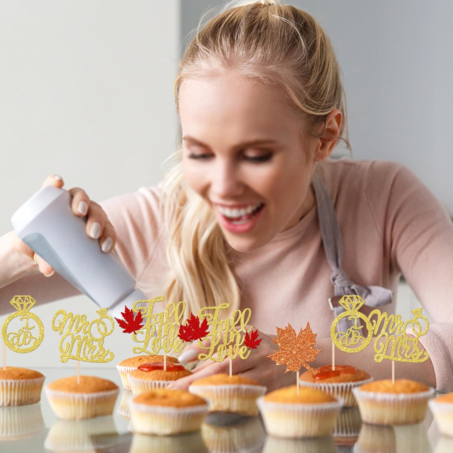 24 PCS Fall in Love Cupcake Toppers Glitter Maple Leaf Cupcake Picks Mr & Mrs Diamond I Do Cupcake Decorations for Autumn Wedding Engagement Bridal Shower Theme Party Cake Decorations Supplies
