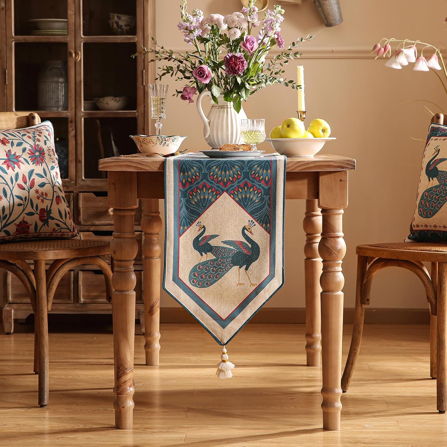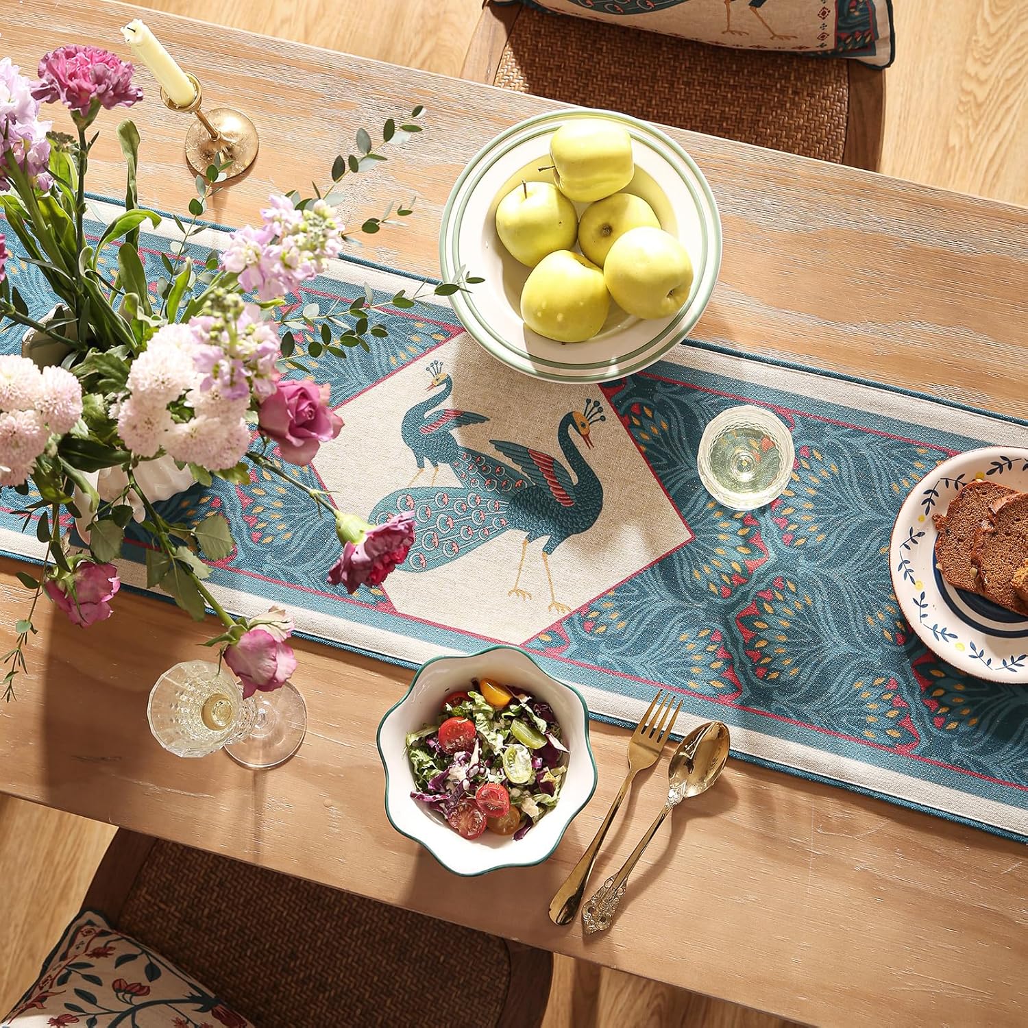 - Unique Design: The main pattern of this table runner matching features peacock feathers in a combination of peacock blue and flaxen colors. The dark outer part and light inner part inject a vivid retro and exquisite visual experience into the table setting.