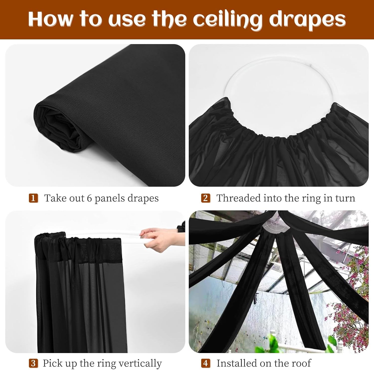 - 🍷Chiffon Ceiling Drapes: The package include 6 panels black wedding ceiling drapes (without hanging pieces). Each wedding extra long curtain measure for 5 feet width x 10 feet length. The sufficient quantity can meet your demands for decorating your weddings, parties, receptions. It will help to create a delicate and aesthetic sense to your wedding ceiling decoration.
