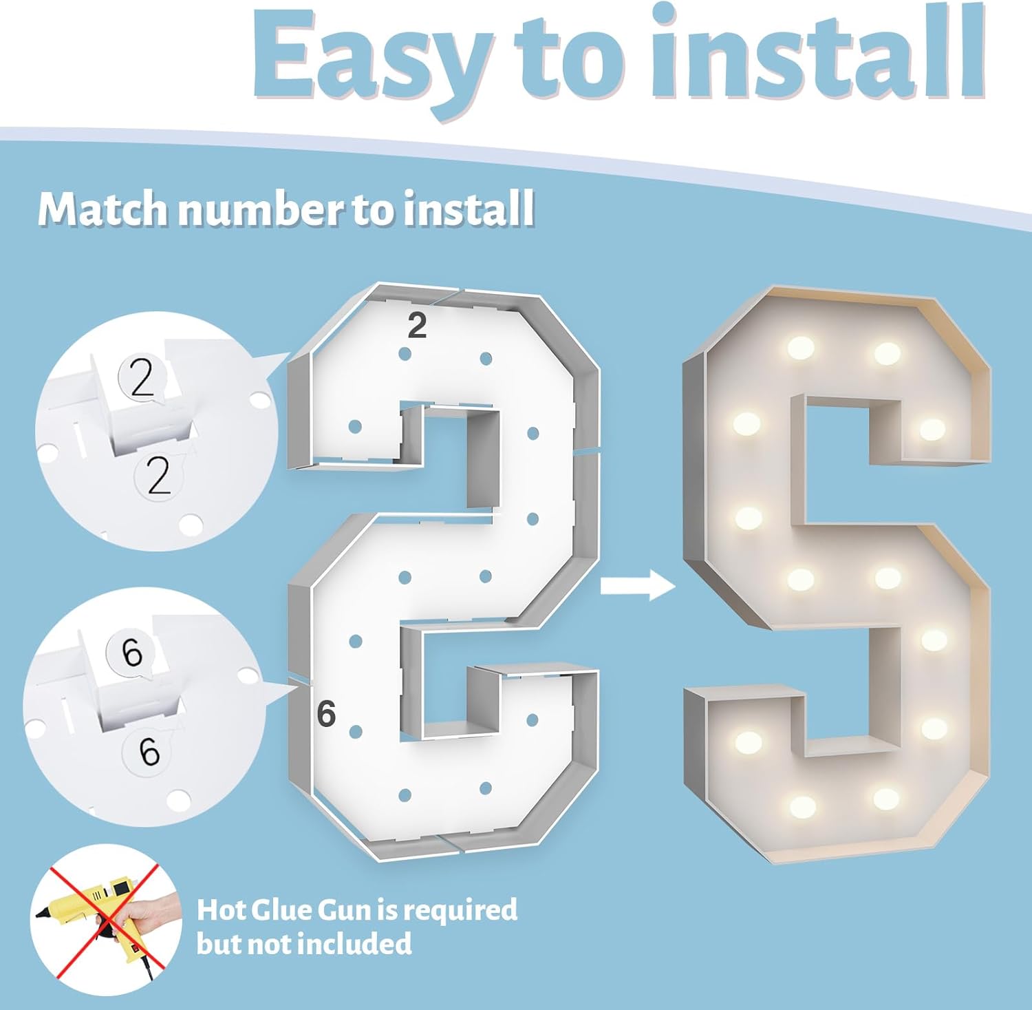 - ASSEMBLY REQUIRED: The marquee numbers need to be assembly with hot glue gun(not included in the package) Assemble it in advance will make your party amazing and fantastic