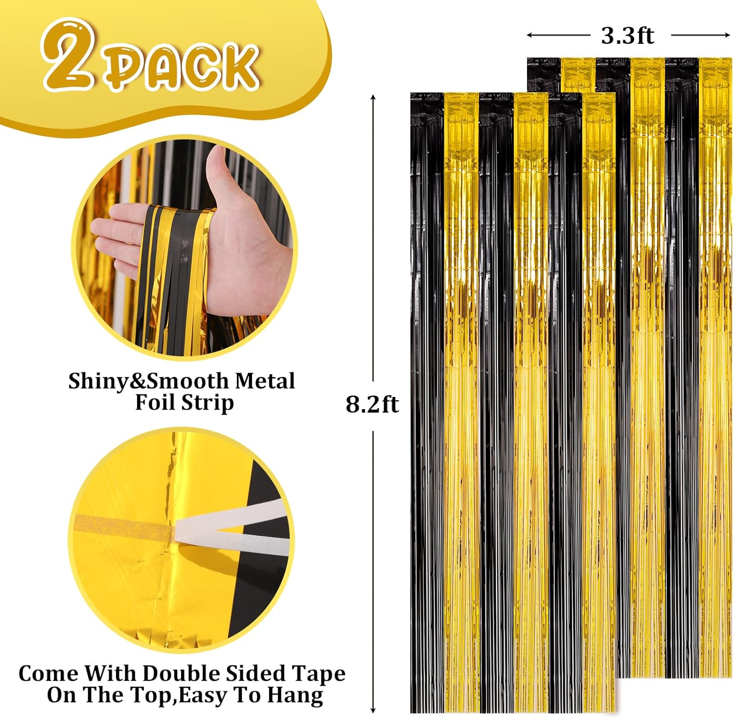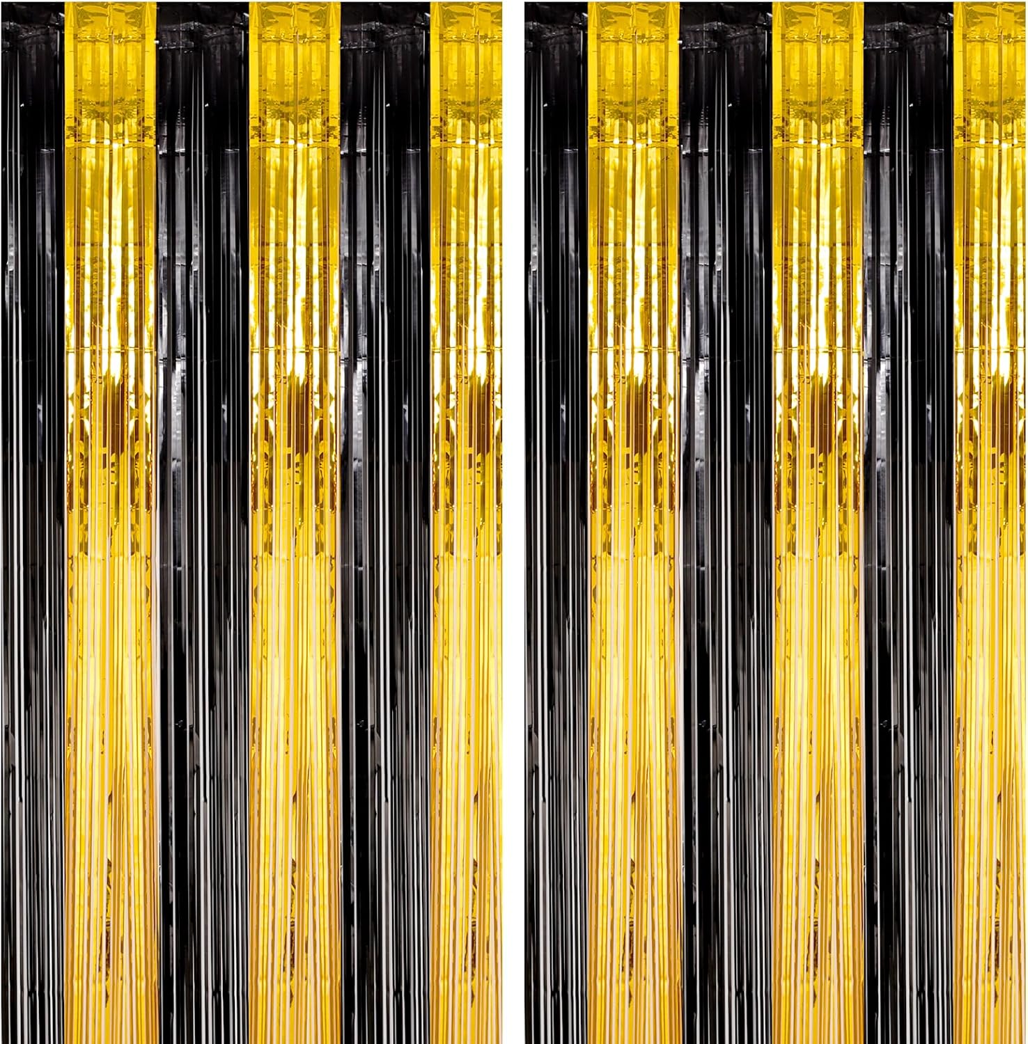 2 Pack Black and Gold Foil Fringe Backdrop Curtains, Tinsel Streamers Birthday Party Decorations, Fringe Backdrop for Graduation, Baby Shower, Gender Reveal, Disco Party