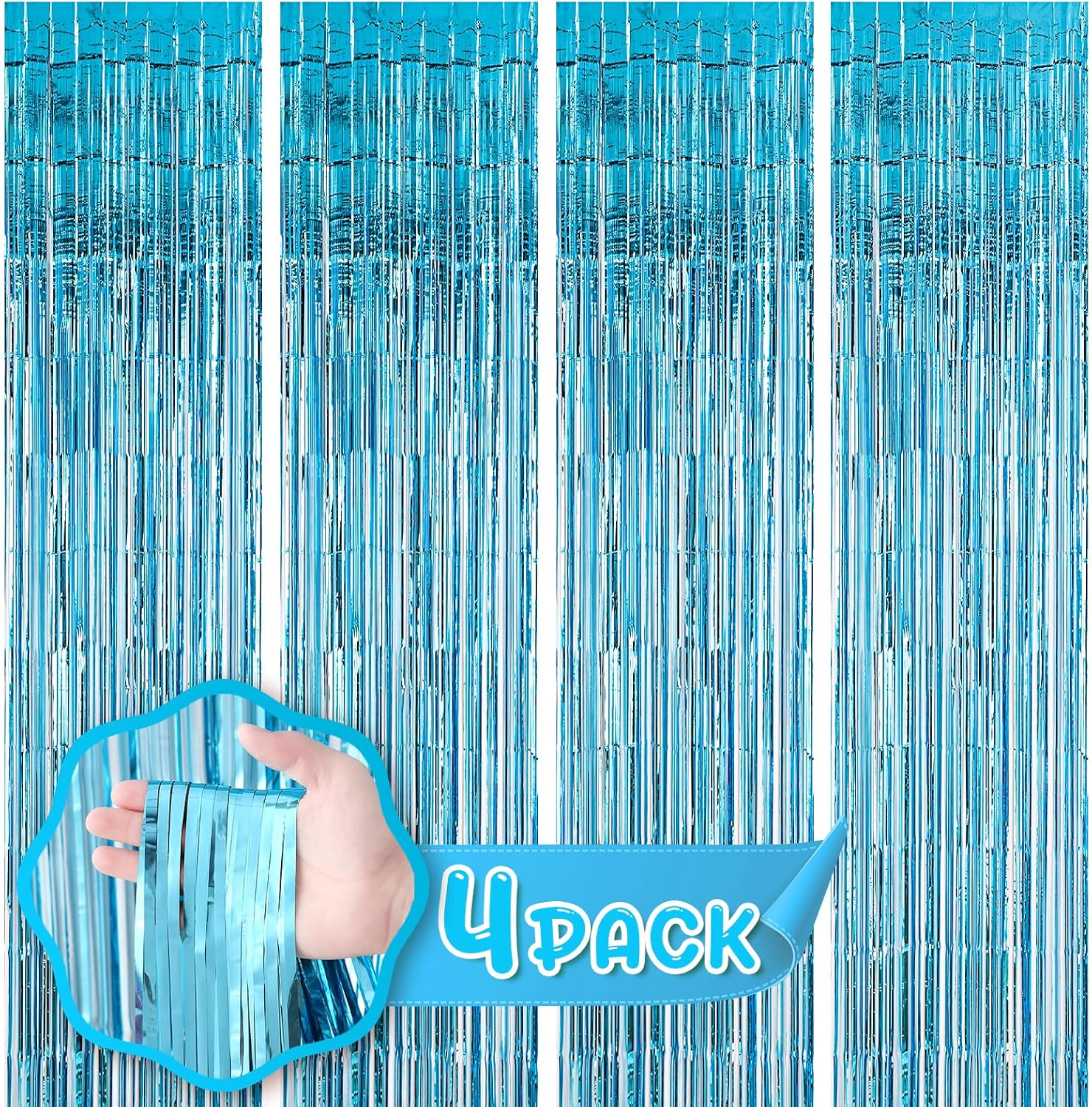 4 Pack 3.3x8.2 Feet Light Blue Foil Fringe Backdrop Curtains, Tinsel Streamers Birthday Party Decorations, Fringe Backdrop for Graduation, Baby Shower, Gender Reveal, Disco Party