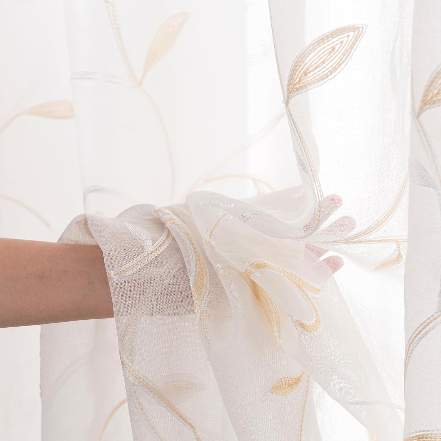 VISIONTEX White Sheer Voile Curtains, Decorative Leaves Embroidery Faux Linen Rod Pocket Window Drapes for Home Kitchen, Living Room and Bedroom 26 x 36 Inch, Set of 2 Curtain Panels