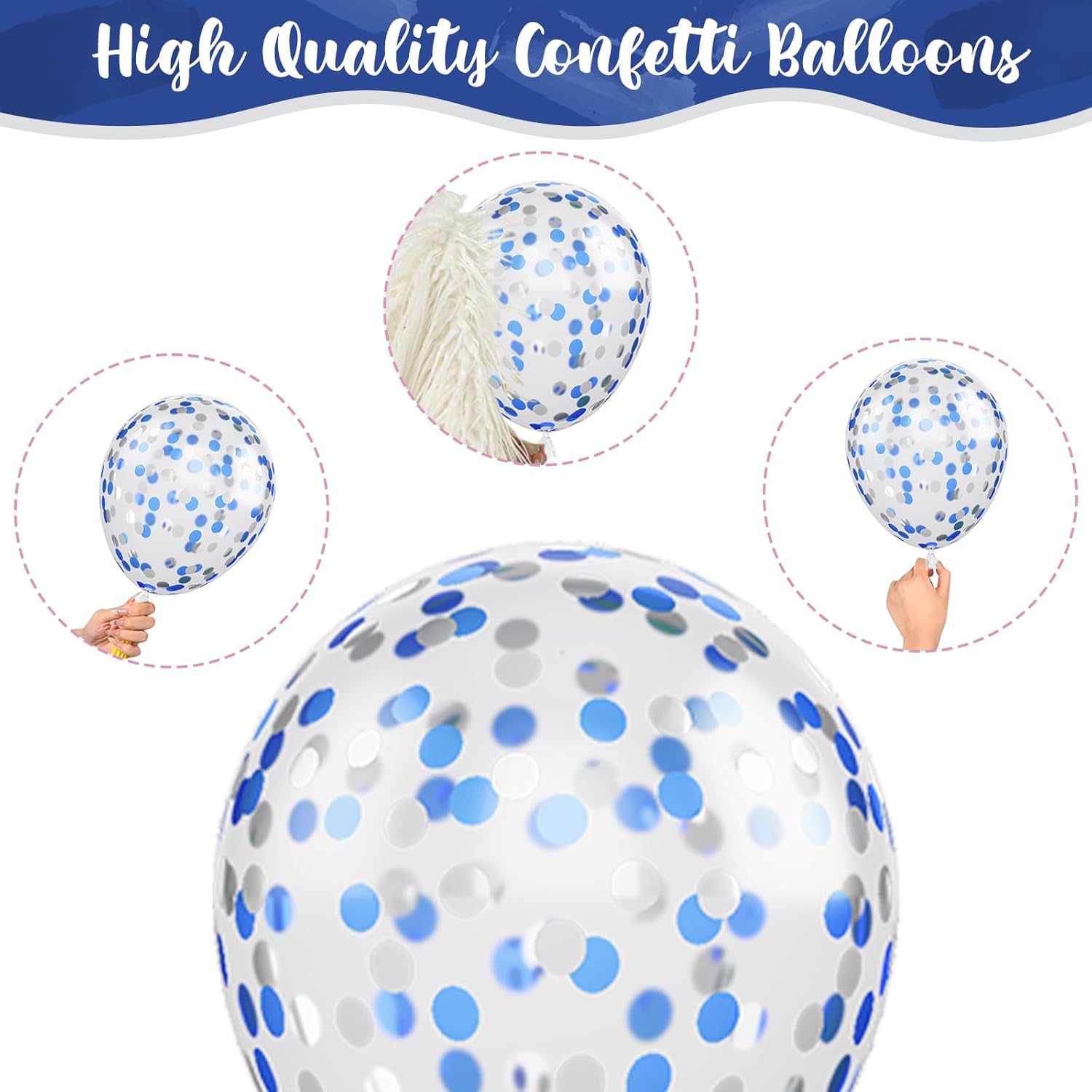 - π Premium & Durable Material - The blue silver confetti balloon kit is made of high quality 100% natural latex, thick thick and long-lasting, not easy to burst, every balloon has been rigorously tested and selected manually, safe for children. They can be filled with air or helium, suggested use with a balloon pump.