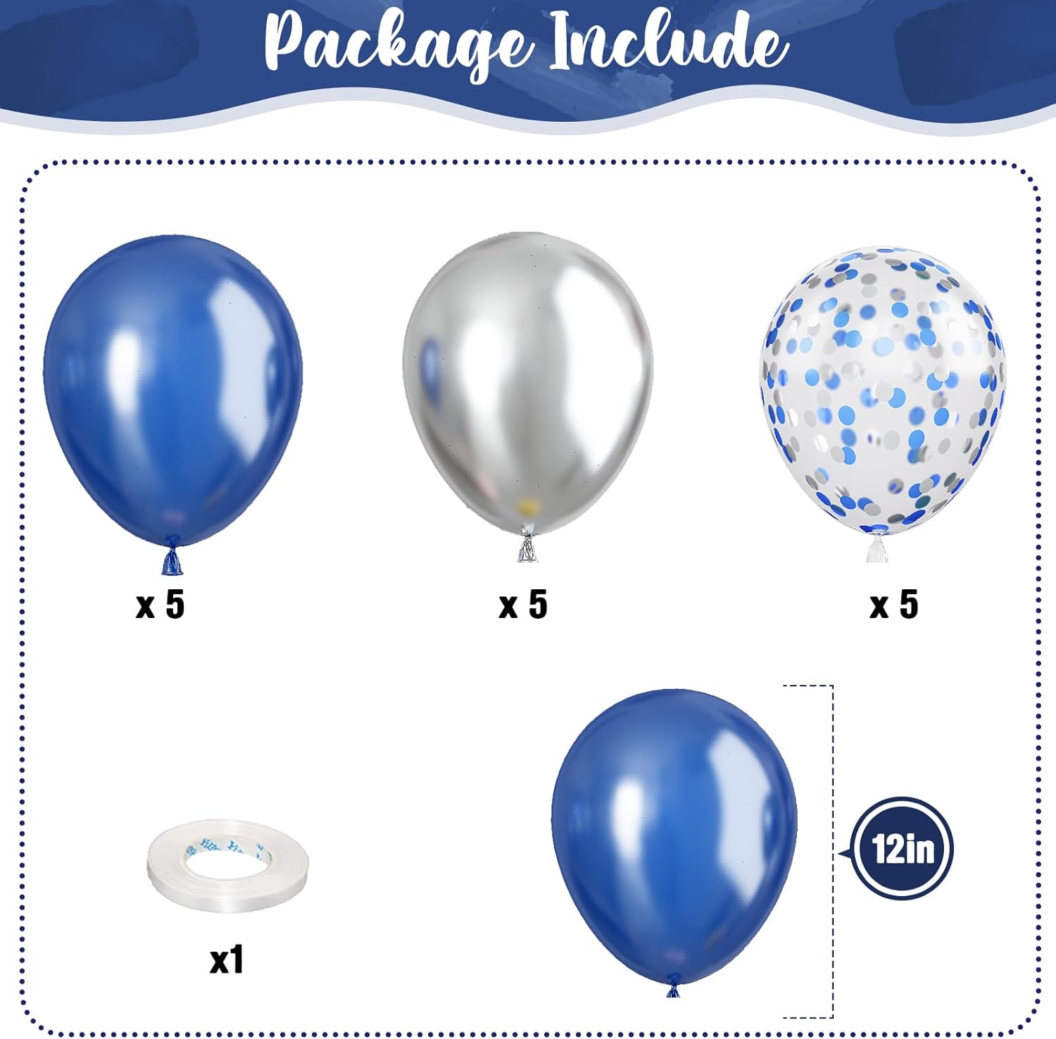 - π Navy Blue Silver Balloons - You will get 35 pieces 12 inch latex party balloons set, includes pearl navy blue 15pcs, metallic silver 10pcs, blue silver confetti 10pcs, come with 1pc white balloon ribbon. Perfect for women men birthday baby bridal shower wedding new year party decorations supplies.