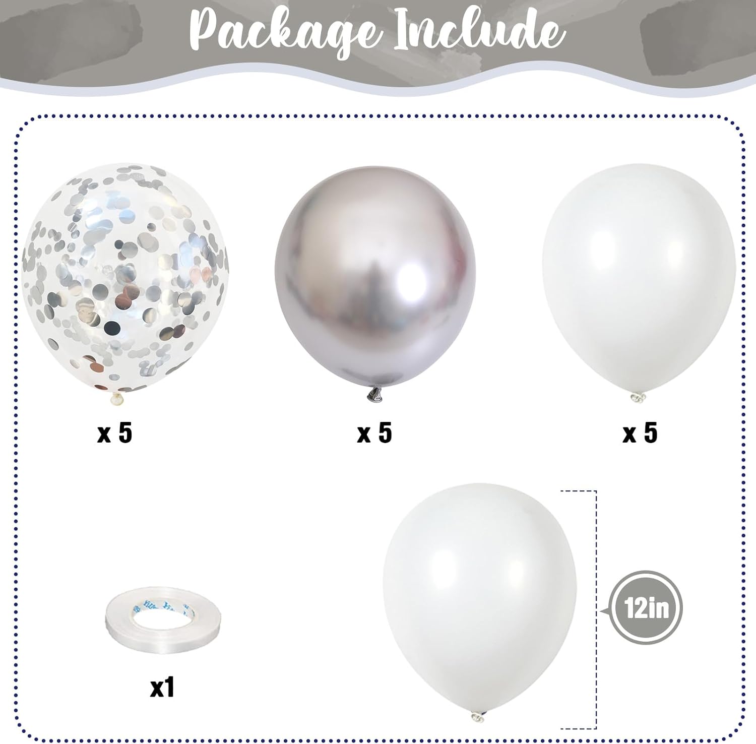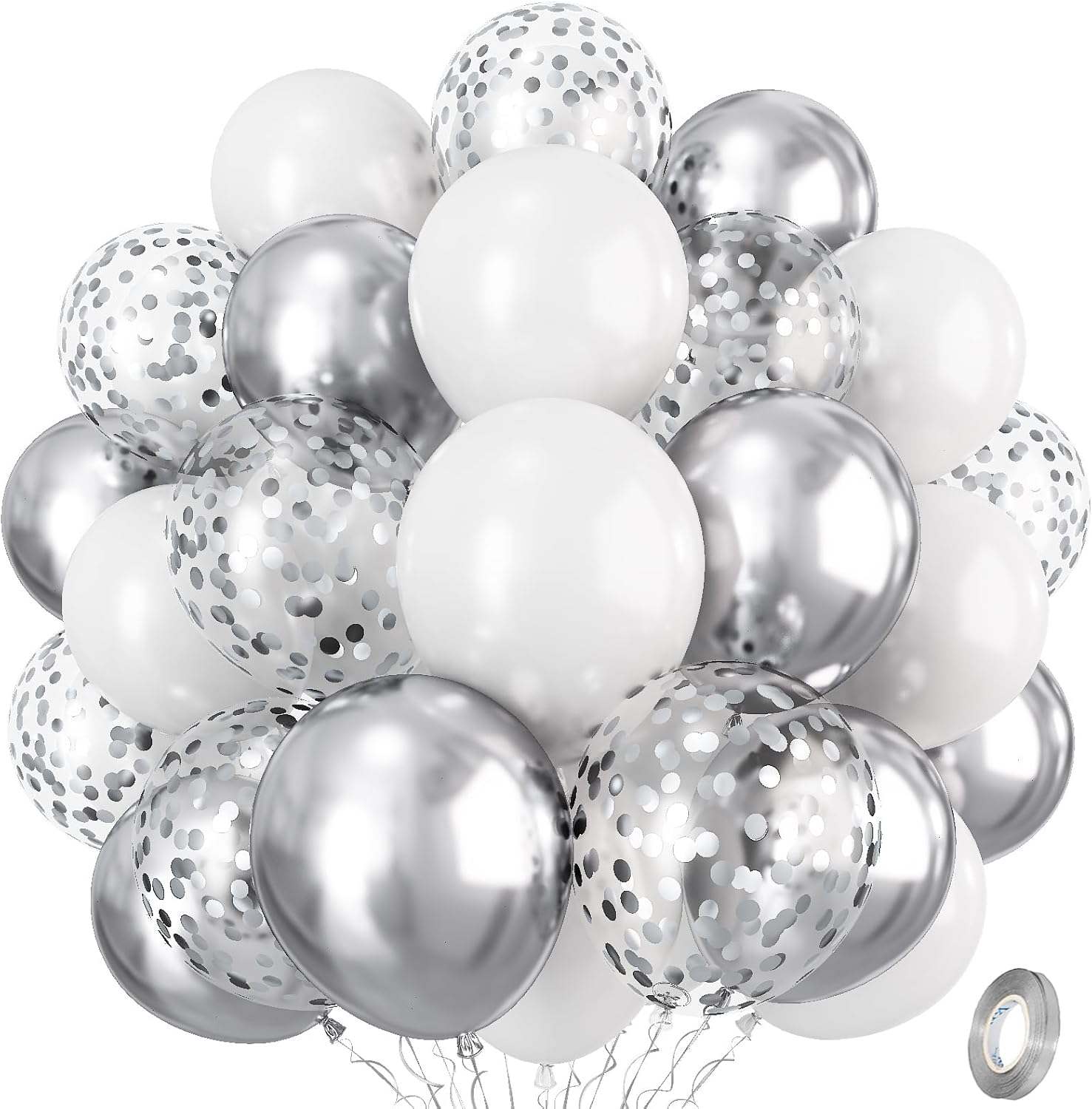 - π Silver White Balloons - You will get 35 pieces 12 inch latex party balloons set, includes white 15pcs, metallic silver 10pcs, silver confetti 10pcs, come with 1pc silver balloon ribbon. Perfect for women men birthday baby bridal shower wedding new year party decorations supplies.
