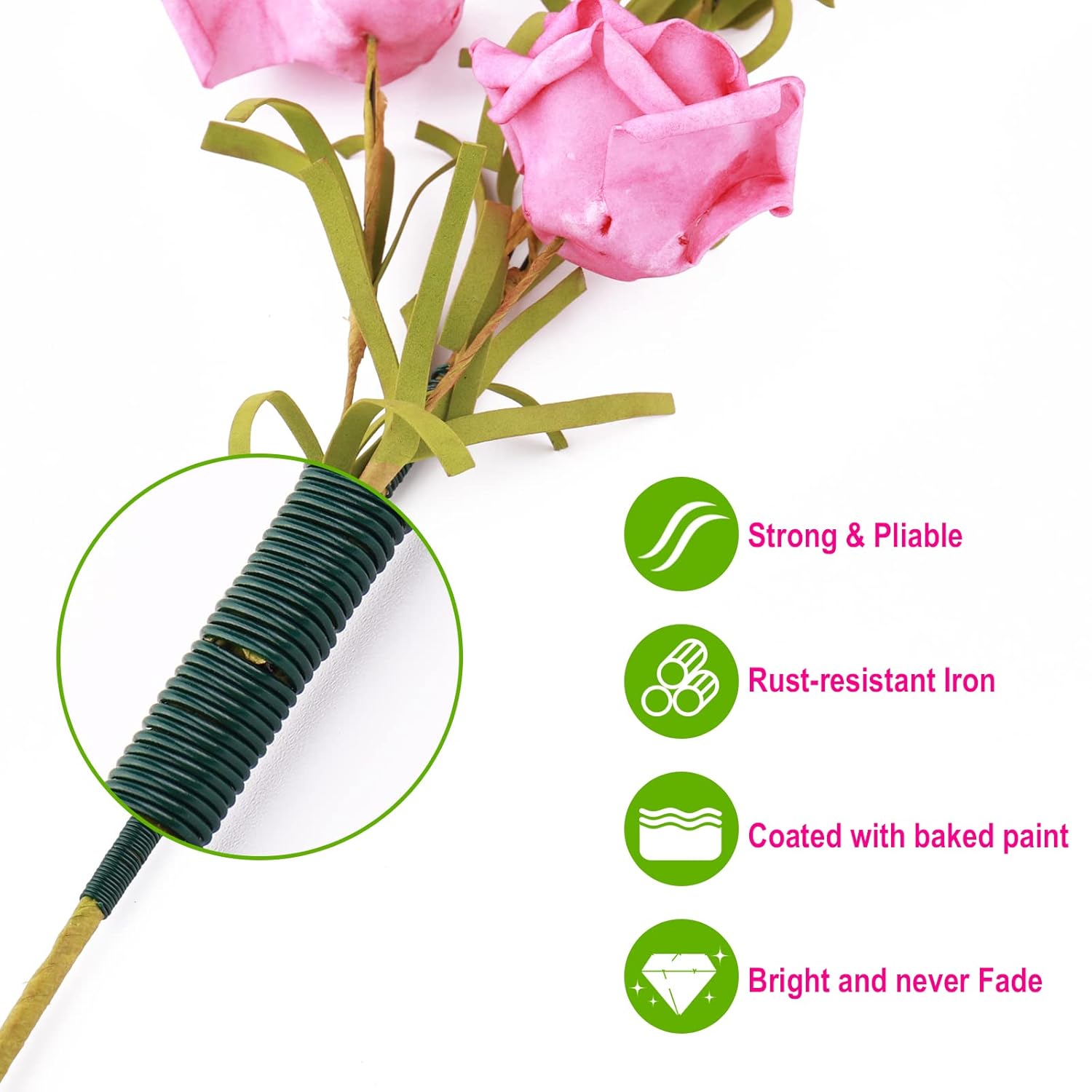 - Good Toughness: The green wire easily conforms to needed shapes and can be easily wound around even the most complex stems. It is strong but Pliable. No matter how you twist the wire, it will not burst.
