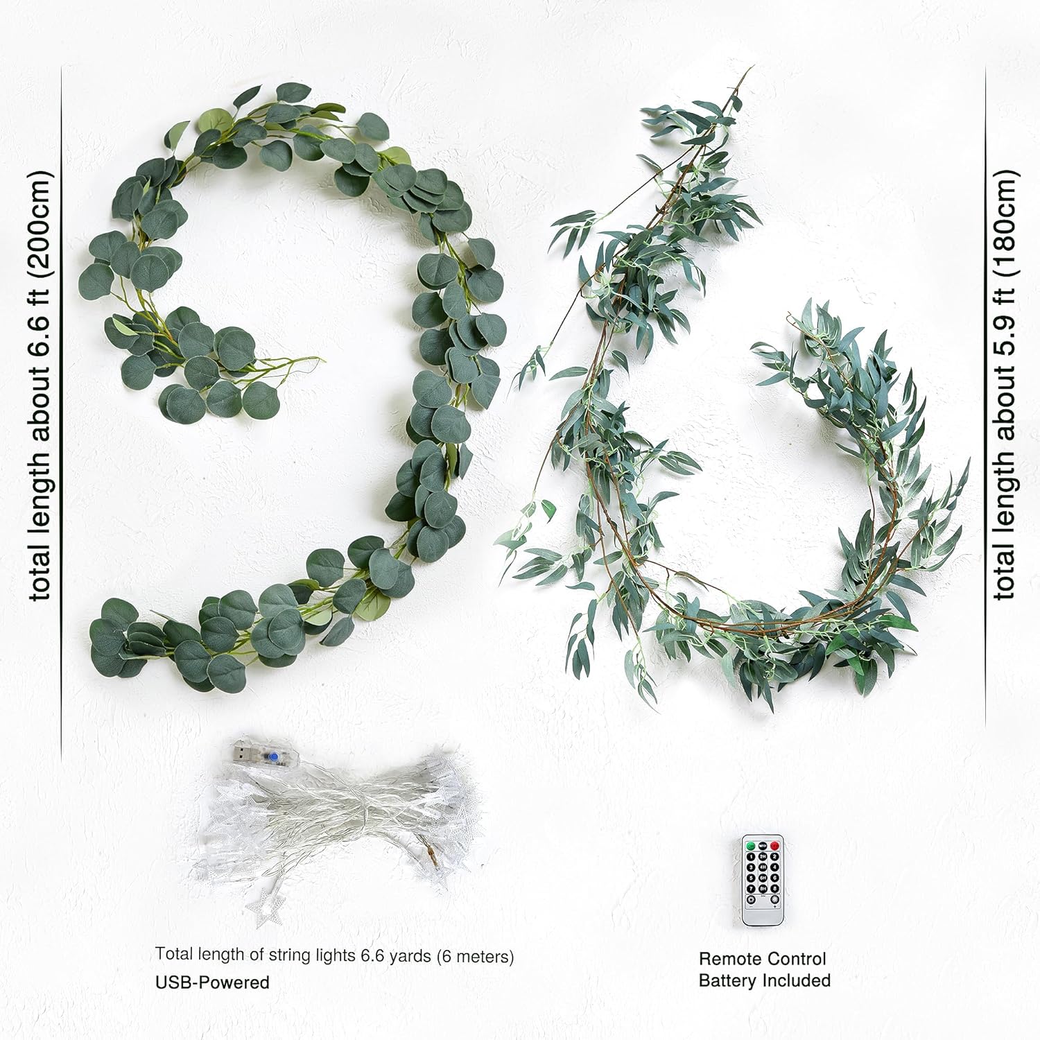 - Celebrate all year and all holidays with our harmonious pair of Willow and Eucalyptus Garlands. A fusion of two distinct natural worlds that come together to create a captivating tapestry of botanical beauty. The 6.6-foot Eucalyptus Garland, with its lifelike silvery-green leaves, intertwines gracefully with the 5.9-foot rustic Willow Leaf Garland, evoking a sense of whimsical elegance and serenity.